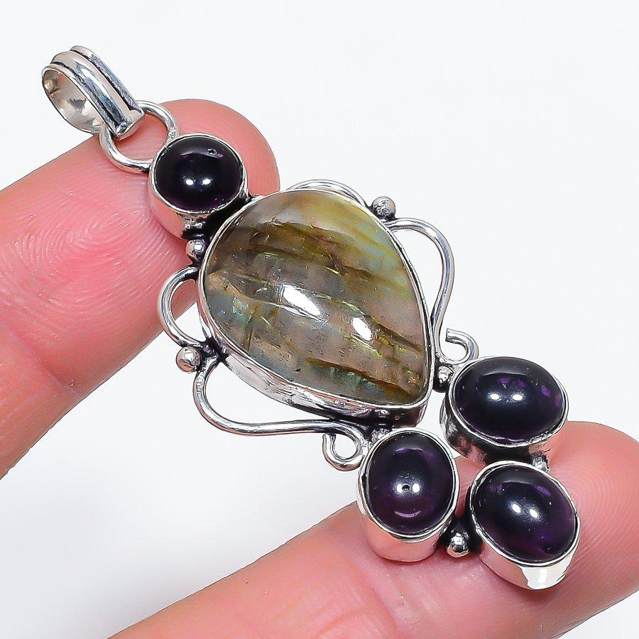 Лабрадорит, Аметист Ручная работа 925 Стерлинговое серебро Ювелирная подвеска 2.52" D4H11