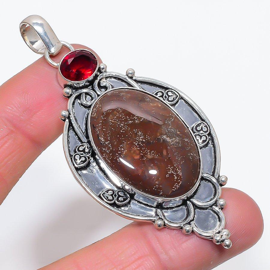 Моховой агат, Гранат Ручная работа 925 Стерлинговое серебро Ювелирная подвеска 2.99"