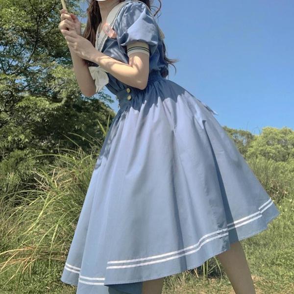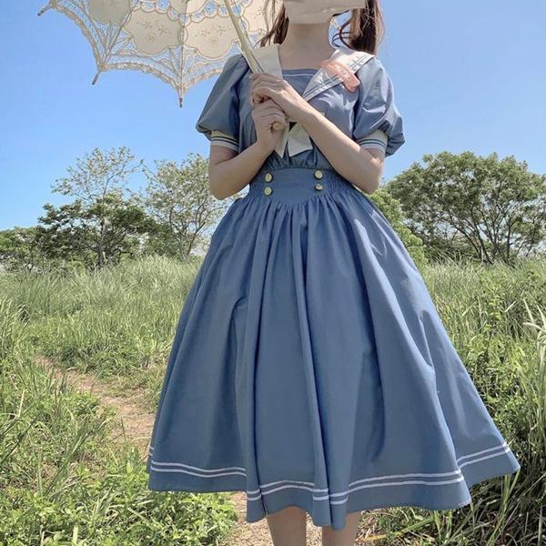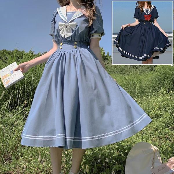 Новое темно-синее платье с матросским воротником, милое женское платье в стиле японской Лолиты с бантом в стиле ретро, кавайное платье в консервативном стиле с короткими рукавами
