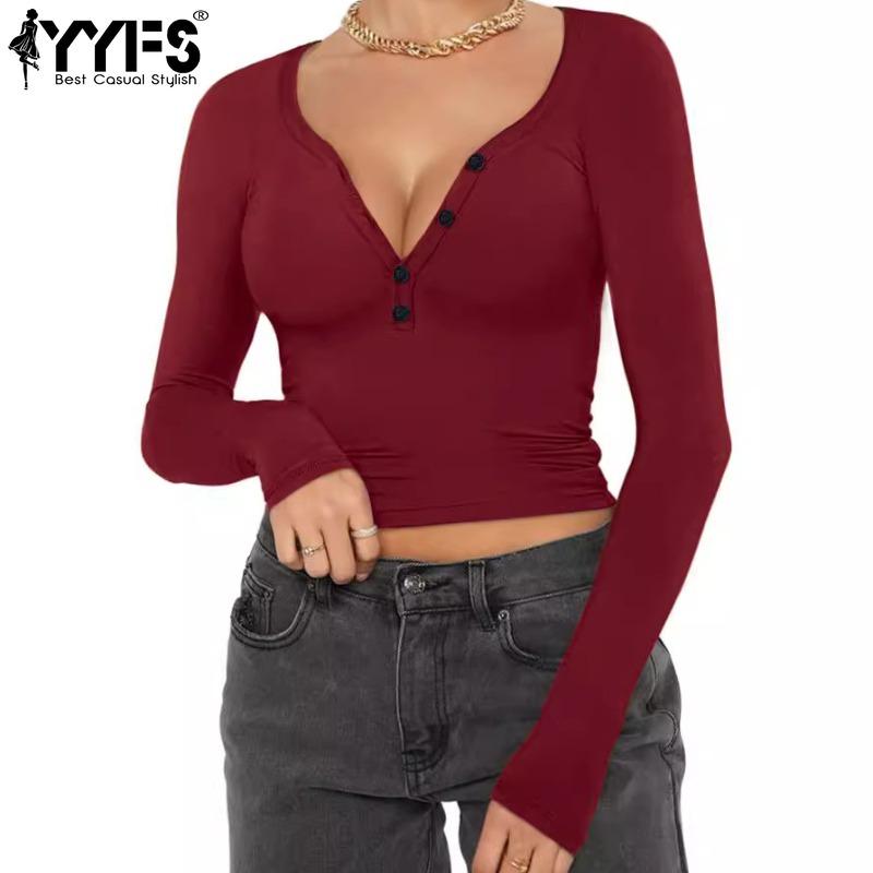 YYFS Женские модные повседневные весенне-осенние однотонные блузки и рубашки с v-образным вырезом и длинным рукавом с принтом