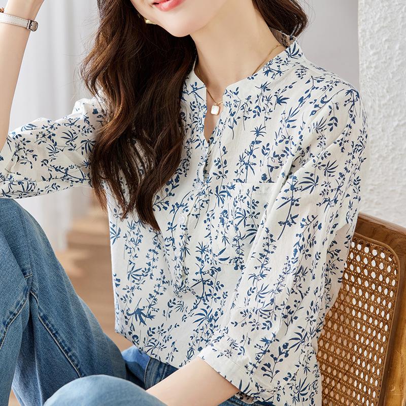 Рубашка с мелким цветочным принтом, женская летняя, новый дизайн, Sense Niche and Thin Temperament, воротник-стойка, рукав семь четвертей, рубашка-пуловер