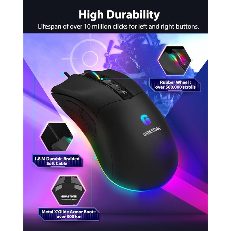 【Повышенная точность】Датчик игрового движка Pixart BC-3332A, до 12 000 точек на дюйм, 5 регулируемых уровней и 8 программируемых кнопок. Цифры DPI можно дополнительно настроить в соответствии с вашими потребностями с помощью бесплатного программного обеспечения Gigastone.