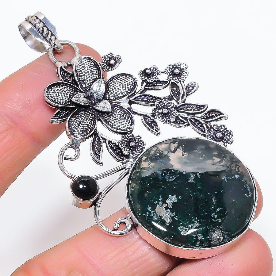 Моховой агат, Оникс Ручная работа 925 стерлинговое серебро Ювелирная подвеска 2,99" K3p77