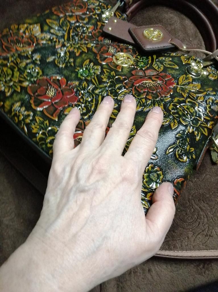 Очень красивая, зелёный цвет листиков наверно будет заметен на улице. Фурнитура классная. Внутри много места и еще два кармашки. Спереди и сзади отделения закрываются кнопкой. Взади карман закрывается на молнию. Отдельное спасибо за упаковку. И коробка, и пакеты, и ещё одна сумка, и внутри плотно забито бумагой. Никакой деформации.