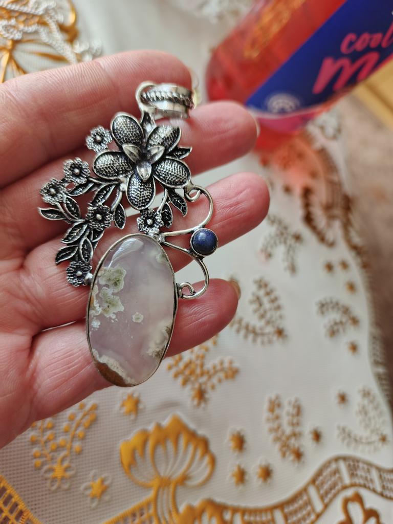Подвеска из натурального мохового агата, лазурита, стерлингового серебра 925 пробы, 3,27 дюйма, F4P13