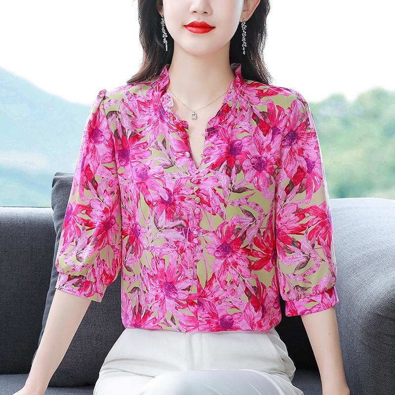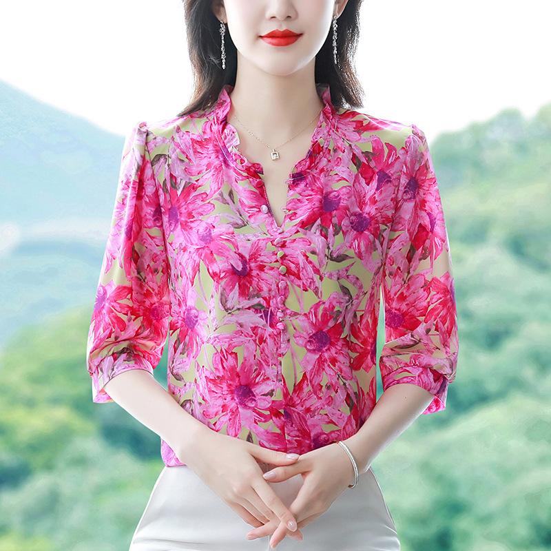 Цветочная шелковая рубашка для женщин с рукавами три четверти, летняя новая модная шифоновая рубашка для мам со средними рукавами, уменьшающая возраст