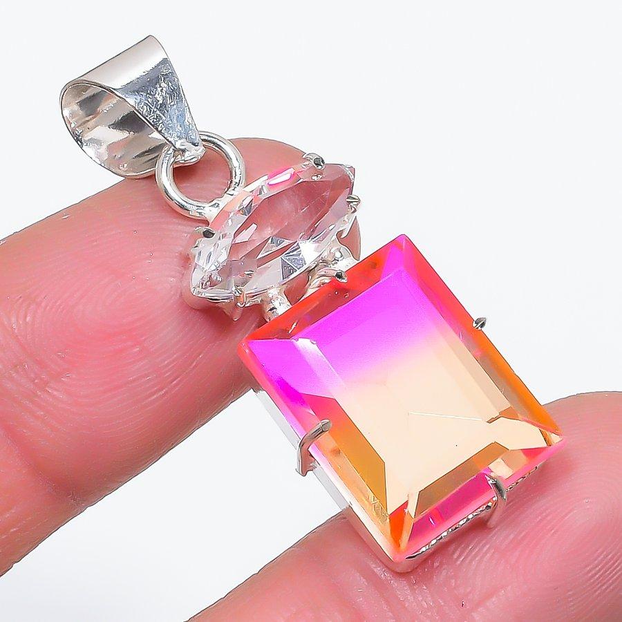 Natural Bi-Color Tourmaline, Topaz 925 Sterling Silver Pendant 1.65" G7j96