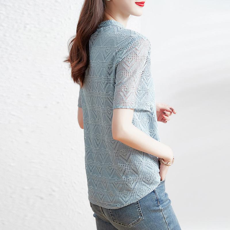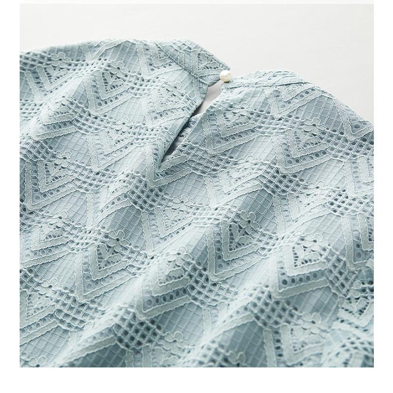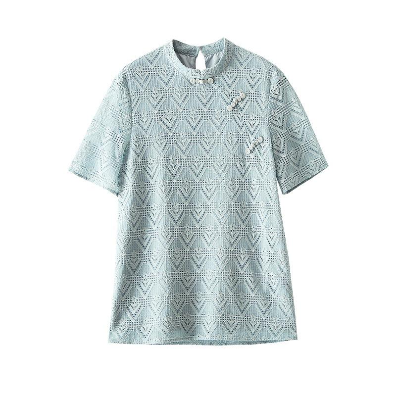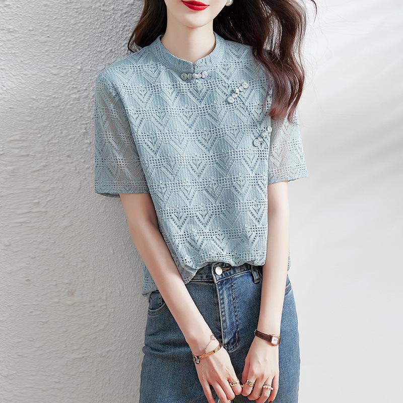 Новый летний кружевной топ для женщин, дизайнерская рубашка в китайском стиле, светло-голубая рубашка с короткими рукавами для женщин