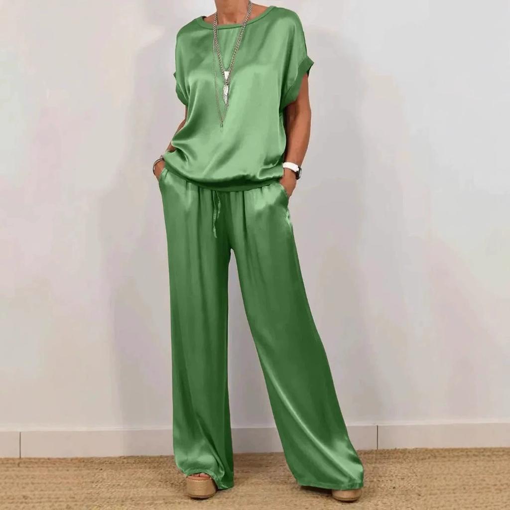 Летний атласный комплект из двух предметов для женщин с круглым вырезом и рукавами «летучая мышь», свободные повседневные брюки со шнуровкой и широкими штанинами, комплект из двух предметов, домашняя одежда для женщин