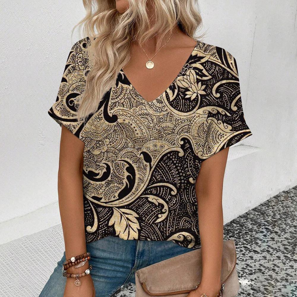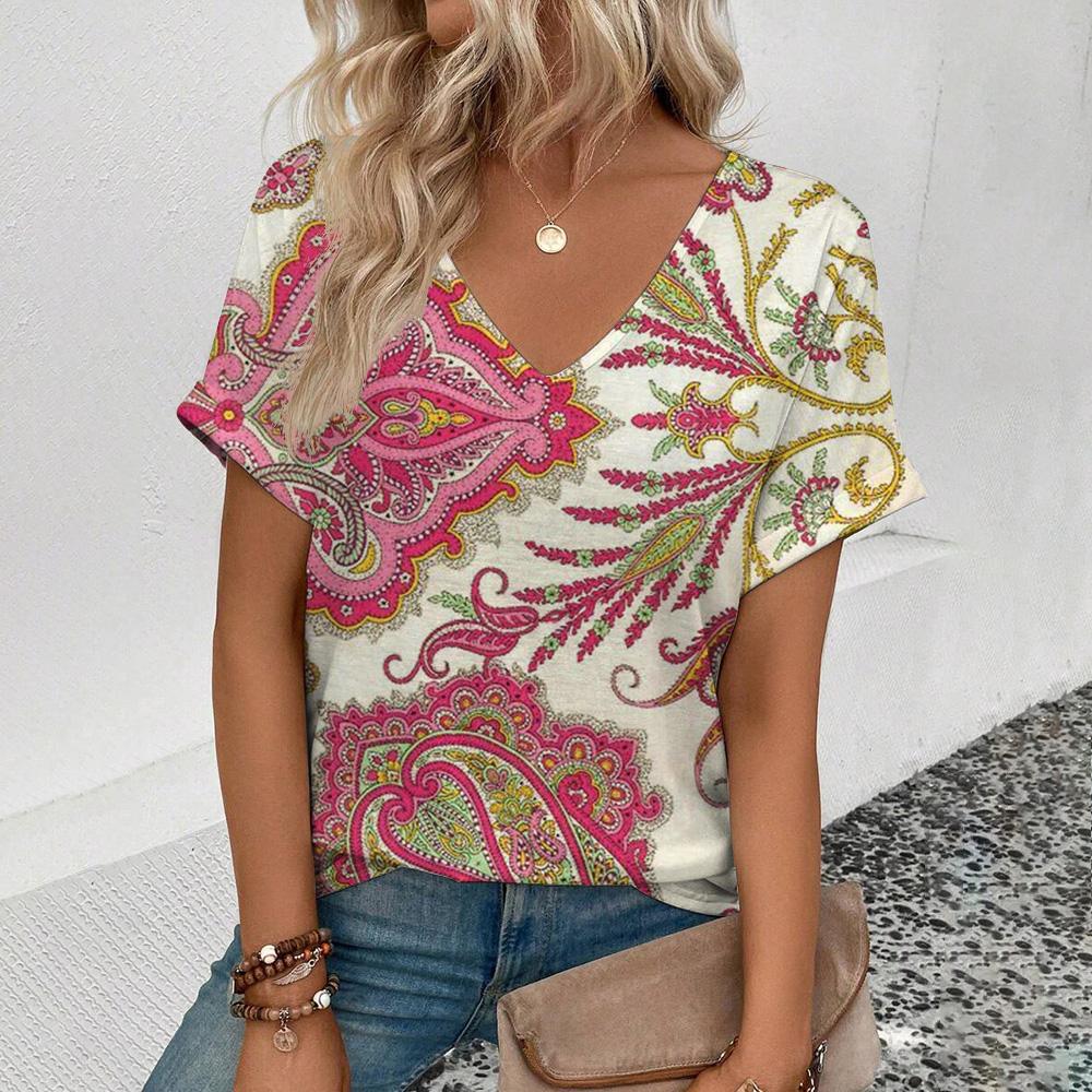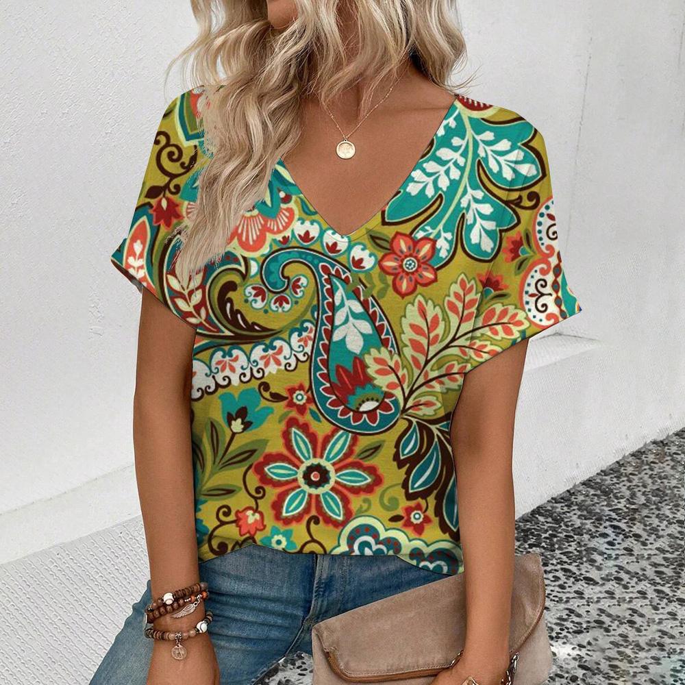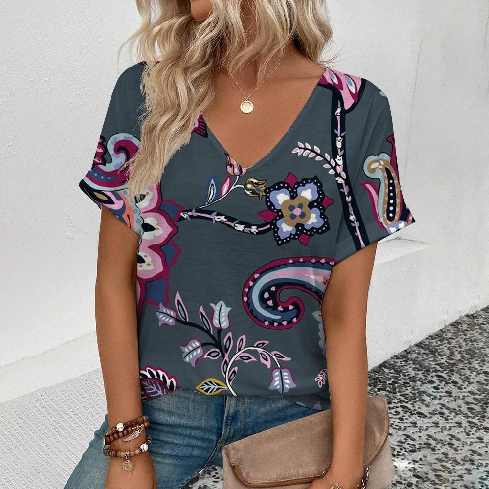 Элегантная женская футболка с V-образным вырезом, женская футболка с коротким рукавом в стиле ретро для отдыха, модная футболка с цветочным узором, популярная женская футболка с принтом