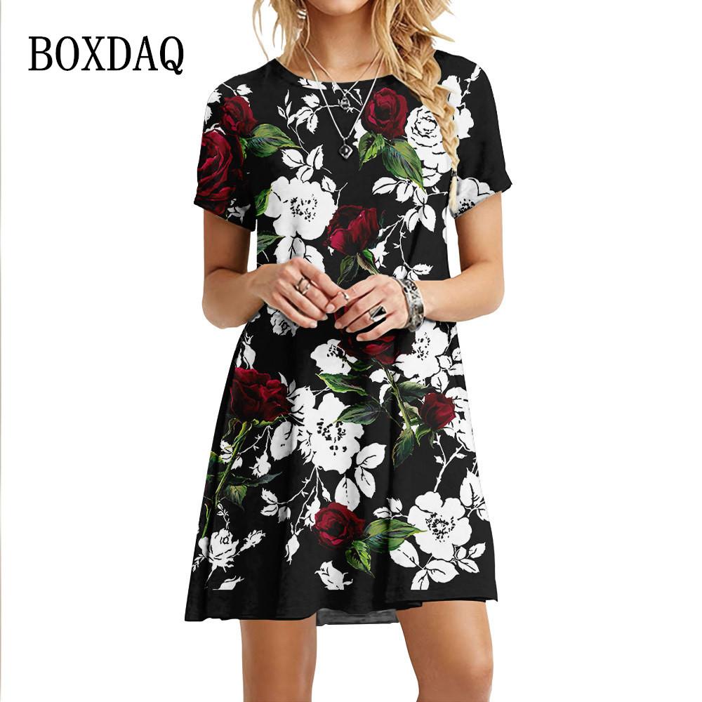 Красные 3D розы цветочные принтованные платья женские летние свободные платья с коротким рукавом модная одежда пляжное отпускное мини-платье