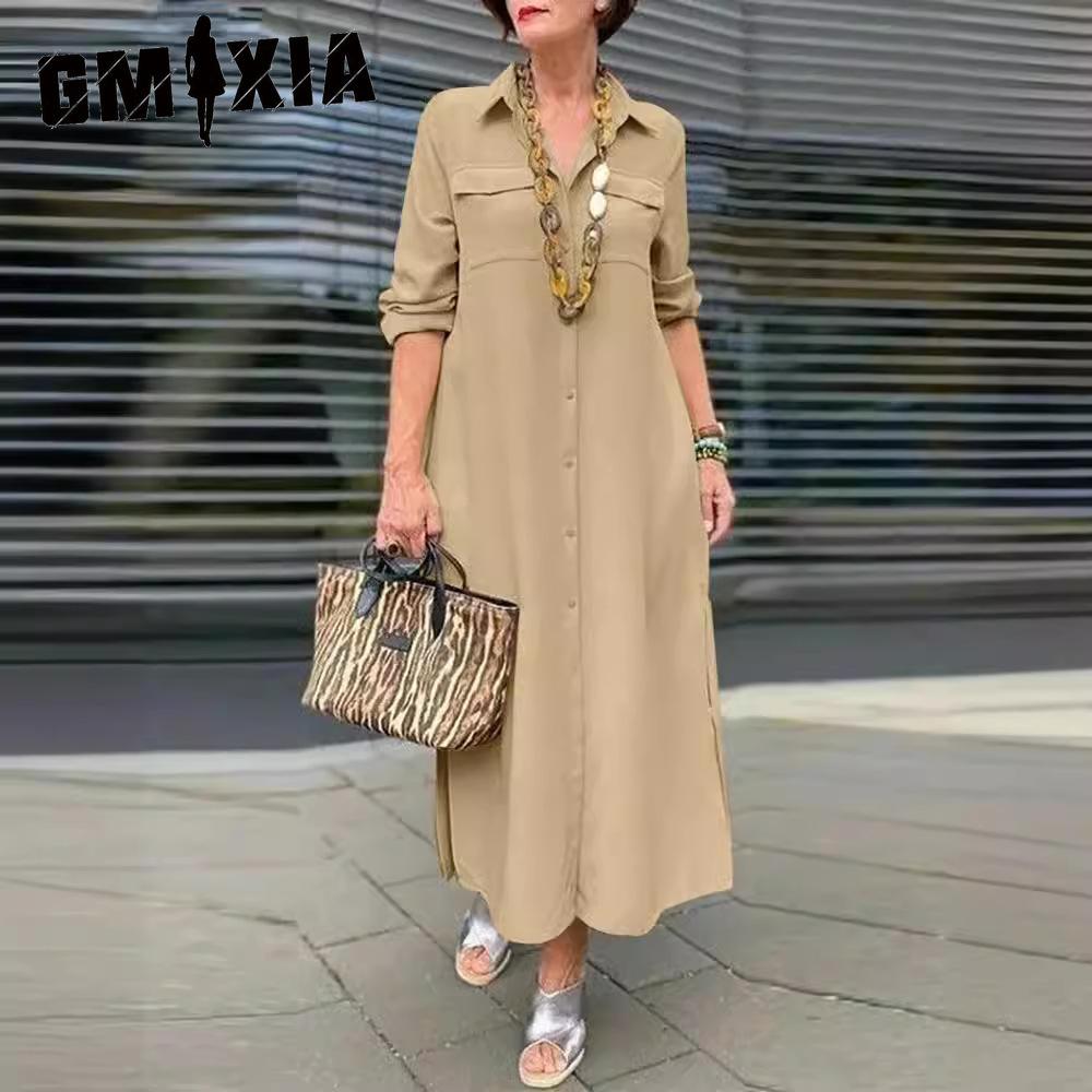 GMXIA Женские новые элегантные однотонные платья с длинным рукавом и воротником-поло больших размеров