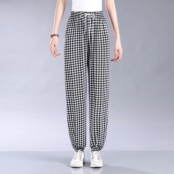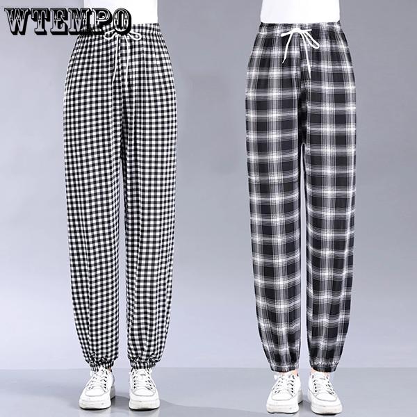 WTEMPO Женские брюки с широкими штанинами в клетку на весну и лето, эластичные, с высокой талией, для мам, свободные, повседневные, укороченные брюки
