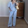 Комплект из хлопка, однотонный, с V-образным вырезом, короткими рукавами, топом и широкими брюками, повседневный женский комплект из 2 предметов, простой повседневный комплект из длинных брюк, весна-лето 2025 г.