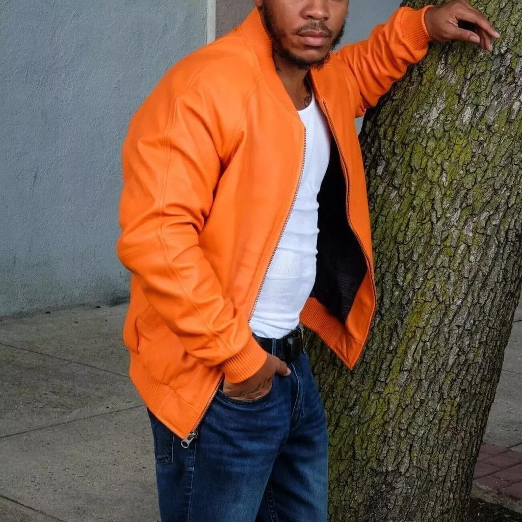 Кожа Ягненок Натуральная Ручная Работа Стильная Мужская Куртка Оранжевая Ручная Работа