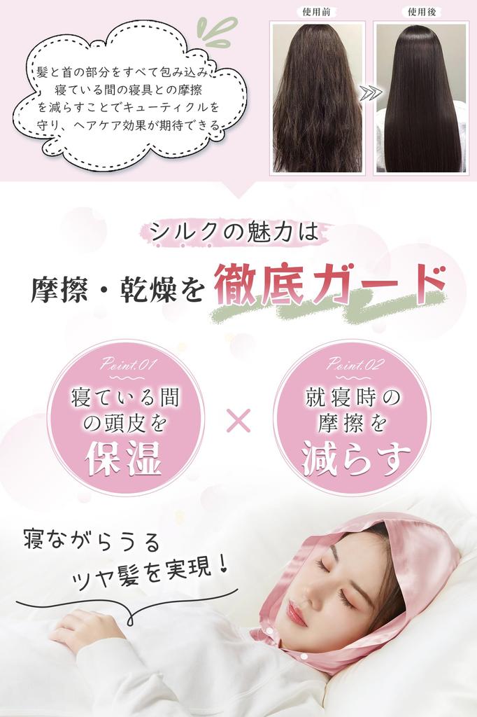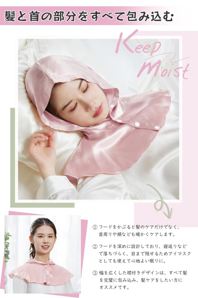 [Уход за волосами во время сна] Сухость кожи головы и трение постельным бельем во время сна могут нанести серьезный вред вашим волосам.. Шелк — это волокно, состоящее из 18 видов аминокислот, связанных вместе, а его основным ингредиентом является белок, такой же, как и в человеческой коже, а также он содержит большое количество фиброина — компонента, который, как можно ожидать, оказывает косметическое воздействие на волосы.. Шелковый ночной колпак обволакивает все ваши волосы и область шеи, уменьшая трение о постельное белье во время сна, защищая кутикулу, уменьшая секущиеся кончики, ломкость и выпадение волос, а также сохраняя влажность от кончиков волос до кожи головы.