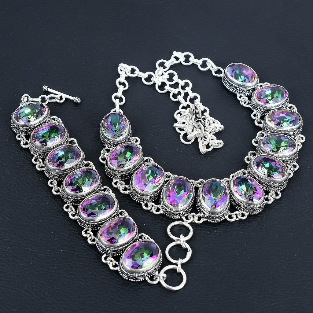 Натуральный радужно-мистик-топаз драгоценный камень ручной работы из стерлингового серебра 925 пробы, комплект браслетов, антикварный комплект ювелирных изделий, свадебные подарки, браслет для подарка на вату