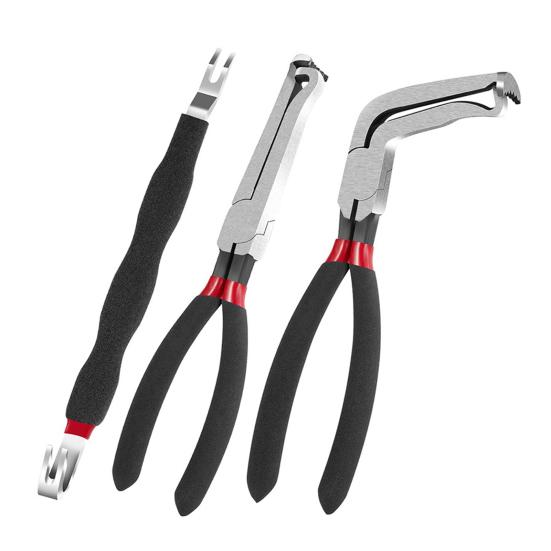 Наши плоскогубцы предназначены для легкого снятия фиксирующих нажимных разъемов в транспортных средствах.. Разработан с углами 60 градусов и прямыми углами для управления одной рукой в ограниченном пространстве. Совместимость со всеми типами транспортных средств — легковыми автомобилями, грузовиками, внедорожниками — для эффективного демонтажа разъемов без повреждений.