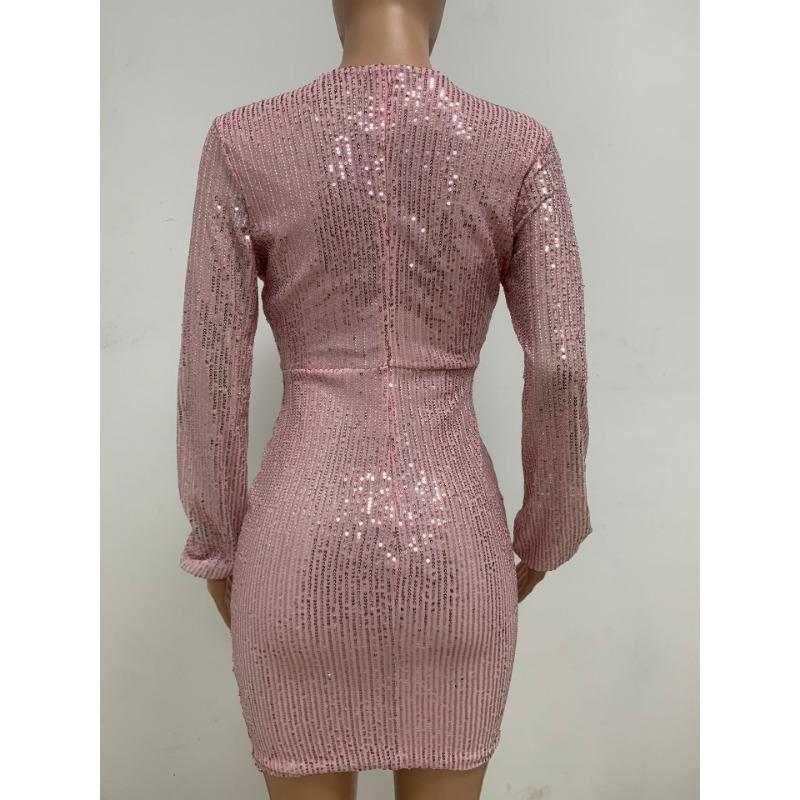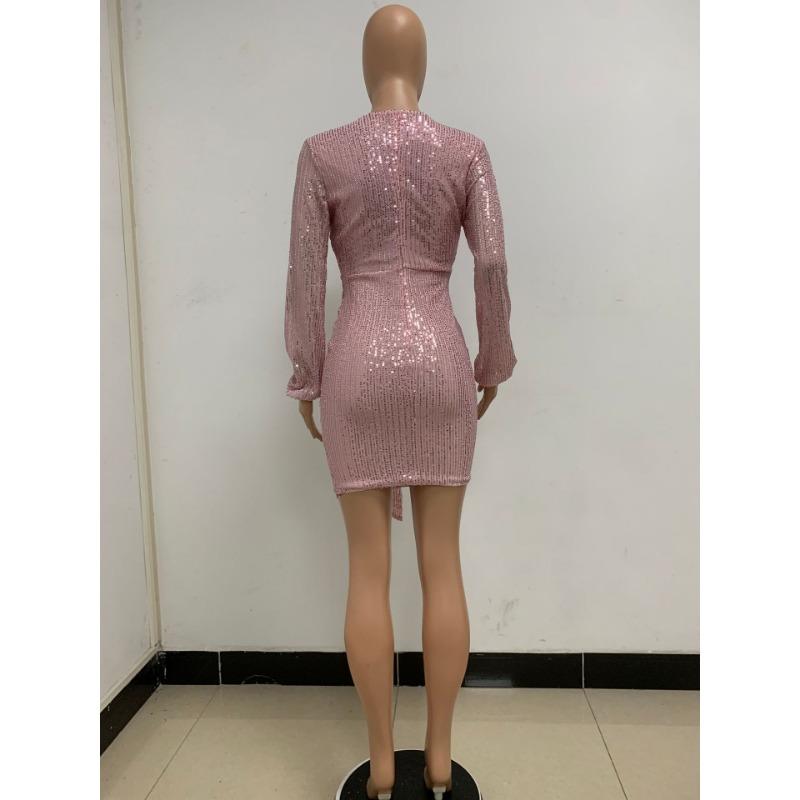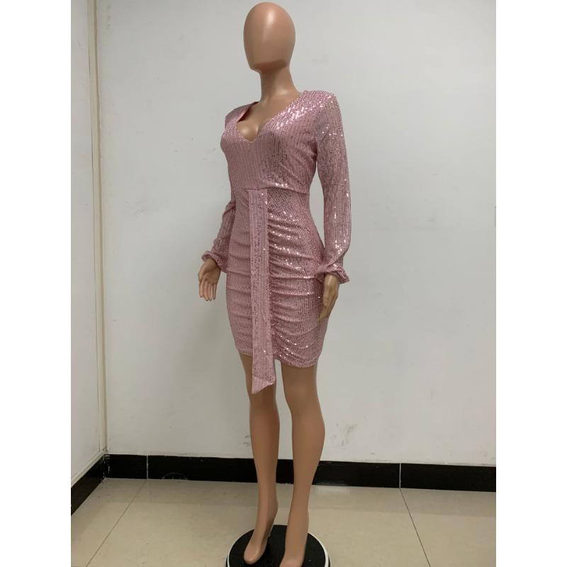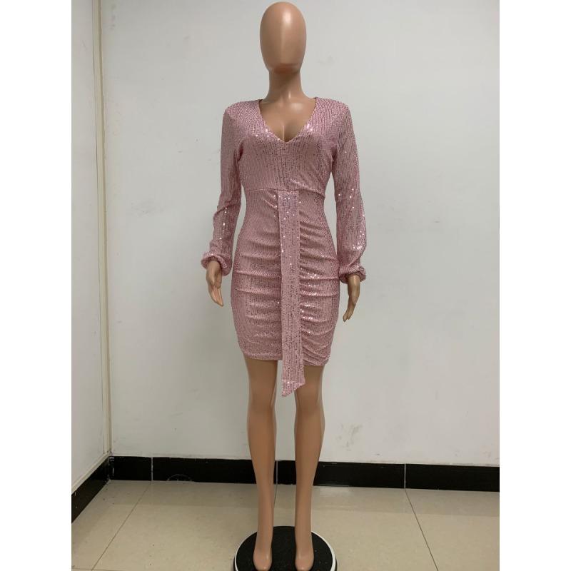 Летнее женское платье с глубоким V-образным вырезом, плиссированное платье-лента с длинными рукавами и пайетками, платье с запахом на бедрах