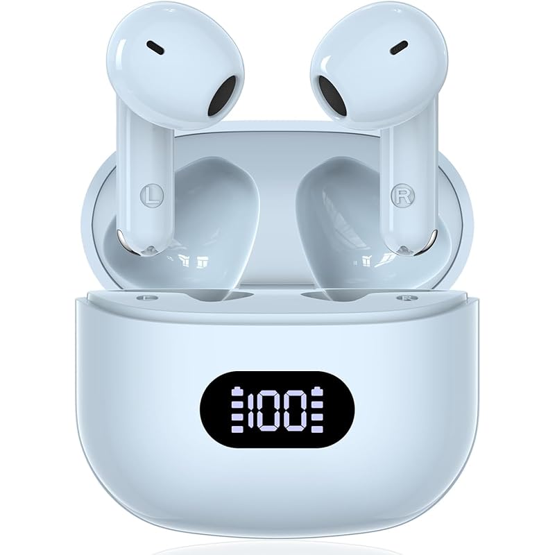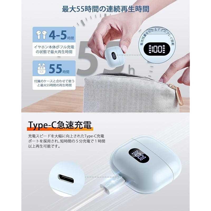 [Ultra-long 55H standby, neat LED display, small size and easy to carry] 🔋This Bluetooth earphone has a large capacity of 400mAh and is designed to save energy, allowing you to play music for 8 hours on a single full charge and make 6 calls.I can take the time.The small and easy-to-carry charging case weighs only 50g, so you won't have to worry about running out of power even if you use the earphones for a long time.💡We also designed an LED display that is easy to understand at a glance, so you can check the charging status of the left and right earphones, and the remaining charge in the charging case is clearly displayed in numbers from 1% to 100%.Furthermore, since some people may not like the high brightness of LED displays, we have changed to a dimly-bright LED display, so you can check the remaining charge in the charging case without disturbing your eyes even in the dark.