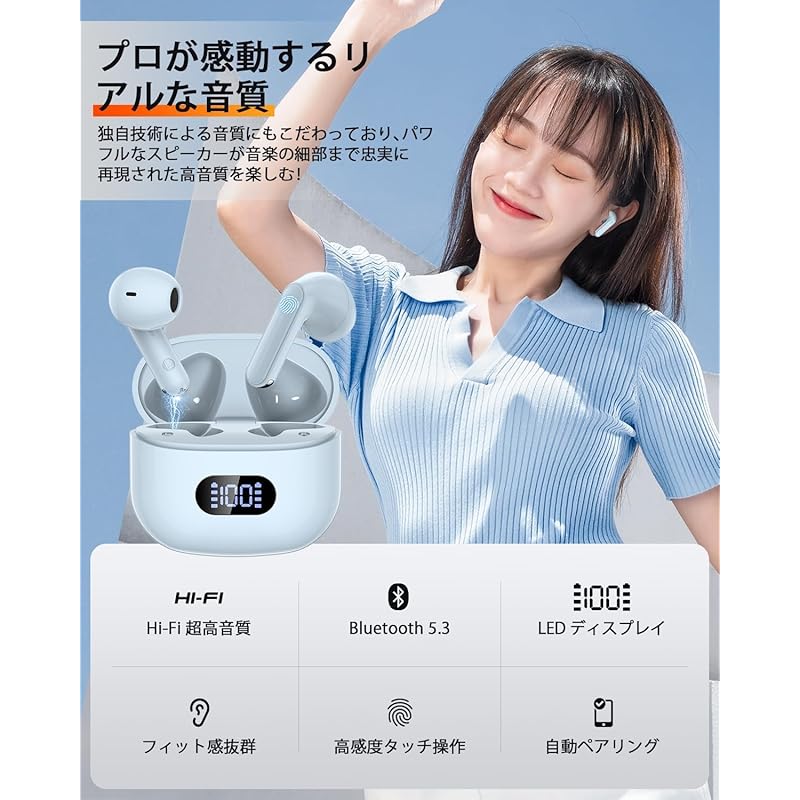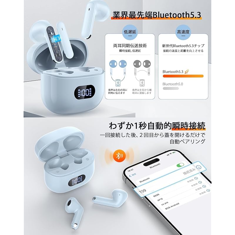 [Cutting-edge bluetooth 5.3 technology/Japanese guidance] Introducing the popular left and right separate bluetooth earphones! Our bluetooth earphones have the industry's latest class bluetooth5.3 chipCompared to earphones with Bluetooth 5.1 or Bluetooth 5.2, the earphones currently on the market can reduce the amount of electricity used, protect stability, reduce "sound delay", and have faster "communication speed" than before.It becomes very fast.👩💻In addition, this time we will also introduce "Japanese voice guidance".Commercially available earphones use voice guidance in universal English, so some people may not be good at English.In addition, considering the age group of those using the earphones, the Japanese voice guidance is very friendly and easy to understand and can be used by both men and women of all ages.🔗 "Instant connection when you open the lid" Manual pairing is required only for the first use.The next time you open the lid, it will automatically search for connected devices and be ready to use when you take them out of the case.It is convenient to use and eliminates the hassle of pairing and repeated connections.