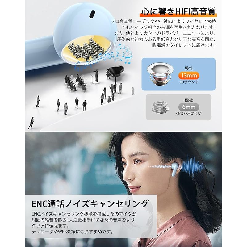 [Enjoy beautiful sound / Hands-free call / ENC noise canceling] 🎵 Our earphones use Hi-Fi high quality audio, so you can hear the faithful reproduction from your ears as if you were in the field, and it also prevents noises that may occur when recording or playing back.noise and distortion are minimized.📞It also has a built-in microphone for calls, and considering that people who don't like noise during calls, this time we have incorporated CVC8.0 + ENC noise canceling, which can reduce 20dB of noise by maximizing 90% of the opposite direction environmental noise.Users can hear clearer audio.🎧In addition, since you can talk with only one ear, those who need to talk for a long time can take turns charging the phone, allowing for efficient conversations that are perfect for online classes and meetings held on ZOOM.Furthermore, our Bluetooth earphones use not only SBC but also "AAC", which has better sound quality and less delay than SBC.Therefore, if you are using Apple products, we recommend that you prepare our Bluetooth earphones "T09" that are compatible with AAC.