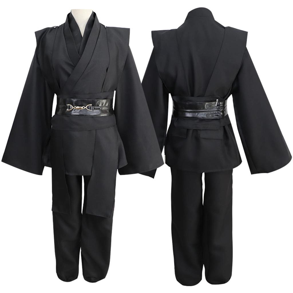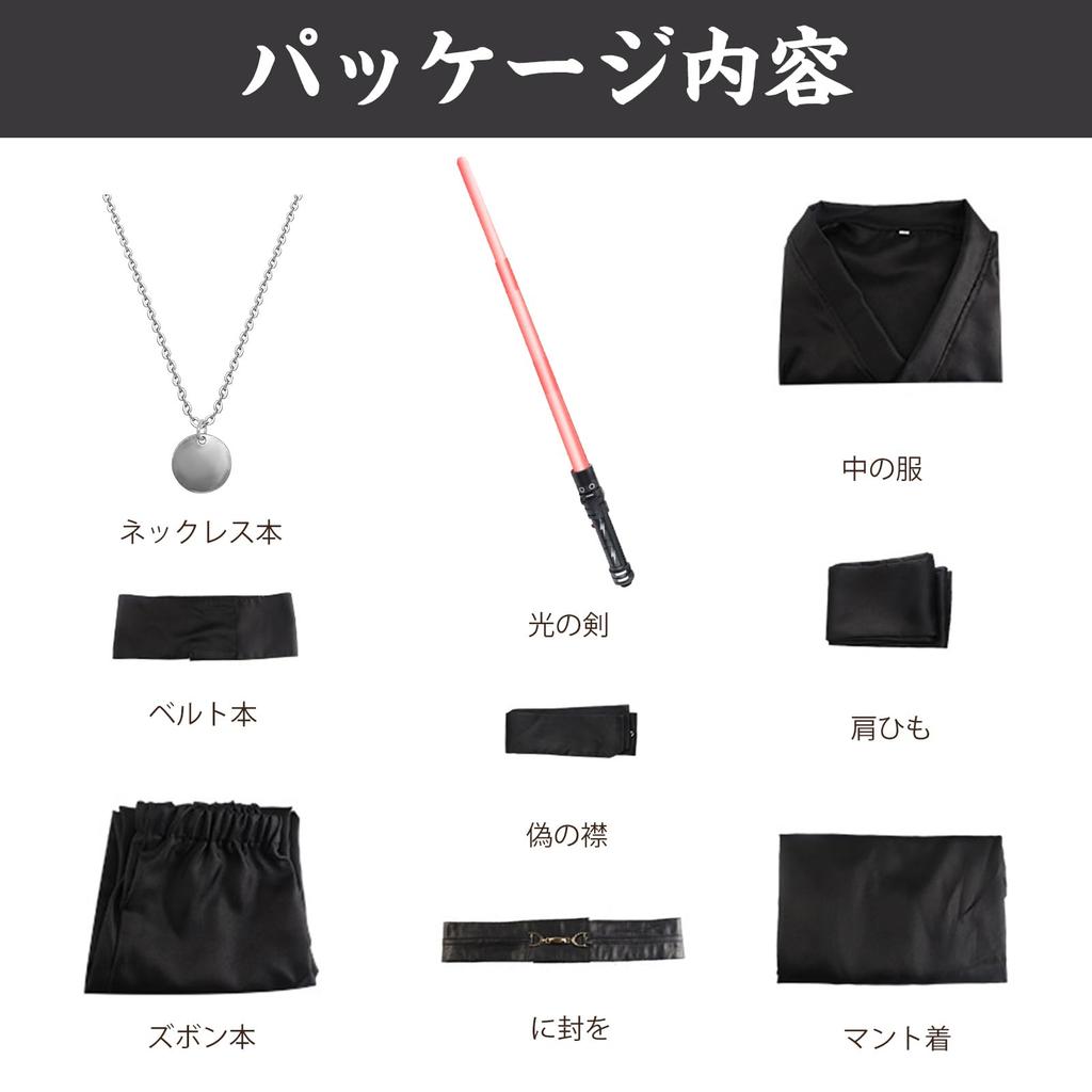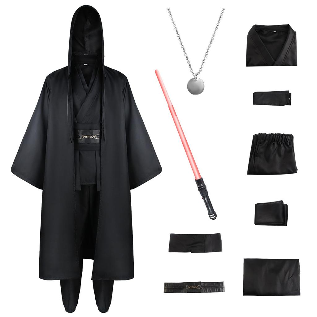 [Роскошный комплект из 8 предметов] Черный плащ + нижнее белье + брюки + пояс*2 + многослойный воротник + ткань через плечо + выдвижной световой меч со звуковым эффектом (нет батарей) + ожерелье. (Пожалуйста, обрати внимание: Батарейки, необходимые для светового меча, в комплект не входят, поэтому, пожалуйста, приобретите их самостоятельно.. Тип требуемой батареи — AAA/AAA.) Существует два вида световых мечей, и они будут выдаваться случайным образом.