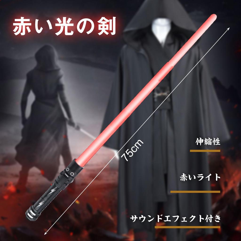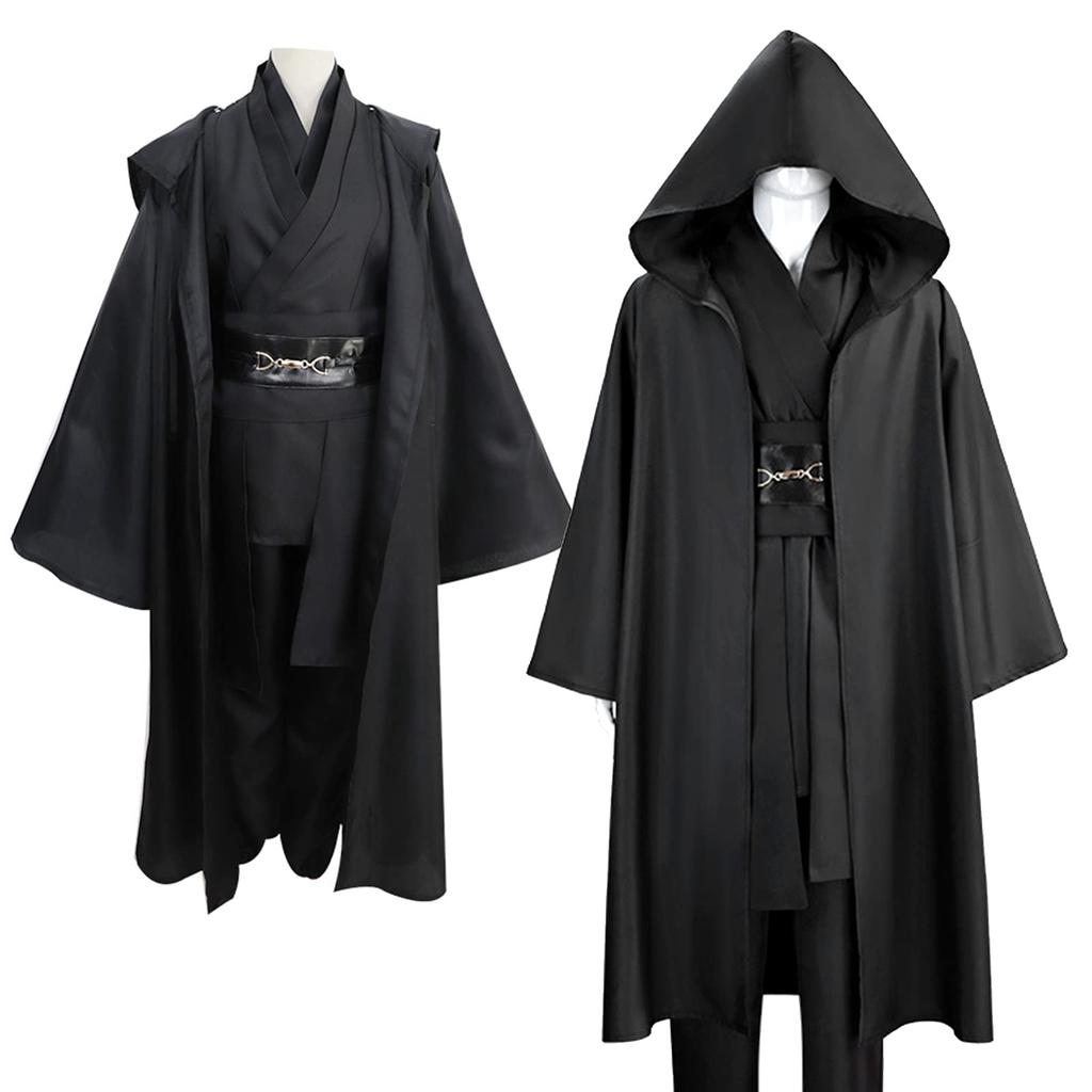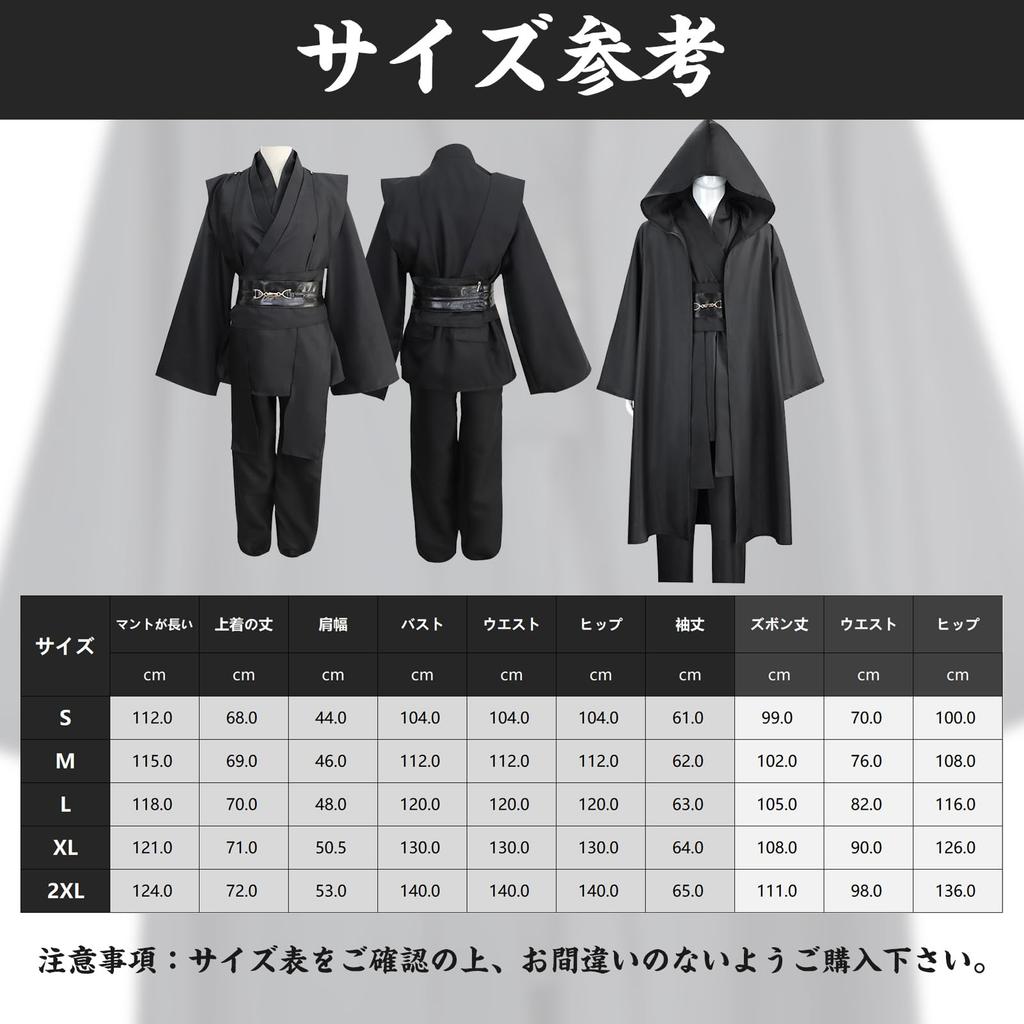[Роскошный комплект из 8 предметов] Черный плащ + нижнее белье + брюки + пояс*2 + многослойный воротник + ткань через плечо + выдвижной световой меч со звуковым эффектом (нет батарей) + ожерелье. (Пожалуйста, обрати внимание: Батарейки, необходимые для светового меча, в комплект не входят, поэтому, пожалуйста, приобретите их самостоятельно.. Тип требуемой батареи — AAA/AAA.) Существует два вида световых мечей, и они будут выдаваться случайным образом.