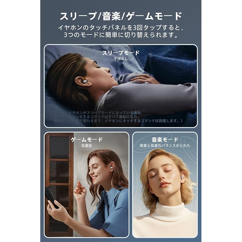 [Режим сна и функция синхронизации] Эти наушники для сна имеют 3 режима: """Режим сна", "Музыкальный режим" и "Игровой режим", и нажмите 3 раза на любой наушник, чтобы переключить режим наушников. Вы можете переключить. [В режиме сна] Дважды нажмите на любой наушник, чтобы завершить настройку для воспроизведения музыки в течение 30 минут/45 минут/60 минут."