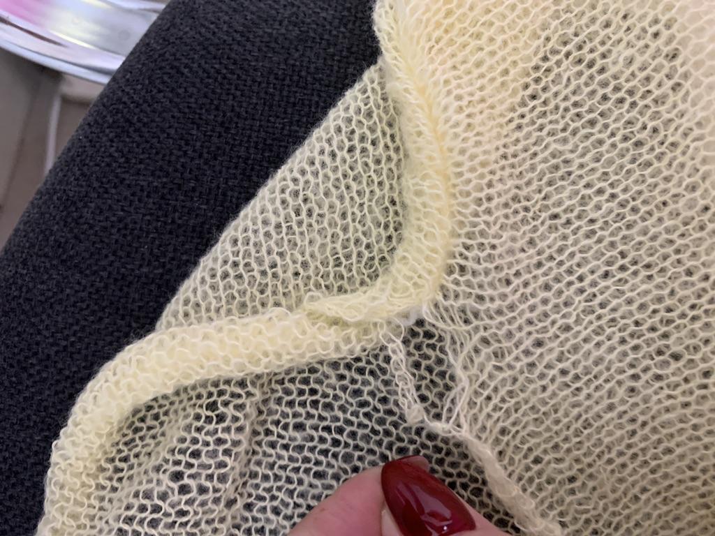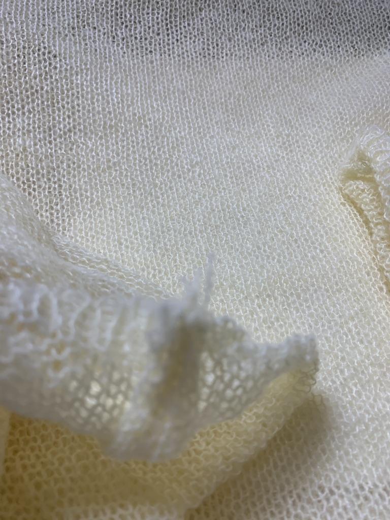 Ткань -марля. Секции разного размера, есть узелки, затяжки. Низ изделия кривой. Очень широкая горловина. Из хорошего:1) цвет соответствует картинке, 2) не колется Затяжки превращаются в дыры, которые расползаются моментально. Выкинула