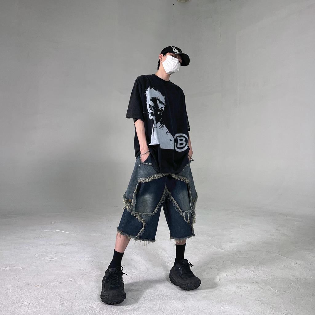 Мужские шорты Harajuku с высокой талией и кисточками, широкие штанины, синие джинсовые шорты 2000-х годов, модные повседневные свободные шорты Y2K Street Baggy Short