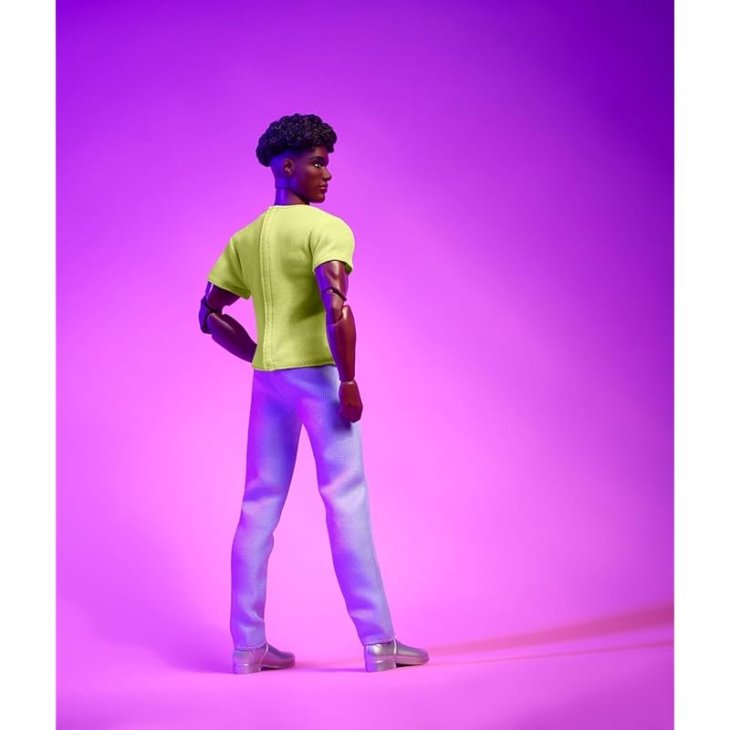 Кукла Кен, 25-я во всей серии, имеет черные волосы с укорененными локонами и начесанными по бокам волосами.