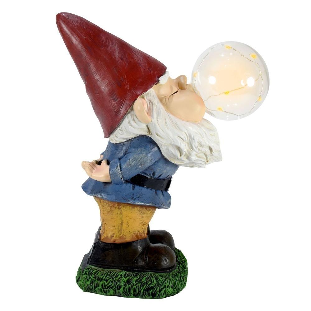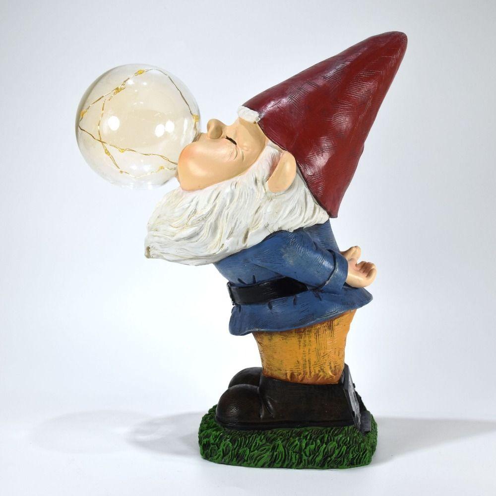- Equipped with a solar-powered light, this gnome statue illuminates your garden at night. The built-in solar panel charges during the day, providing an eco-friendly and cost-effective lighting solution that enhances the beauty and ambiance of your outdoor area after dark.