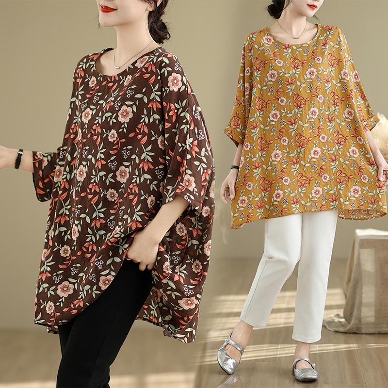 DIMANAF 2025 Summer T-Shirt Plus Size Women Flower Printing Batwing Sleeve Vintage Loose Tops Casual — купить товар онлайн с бесплатной доставкой по всему миру!