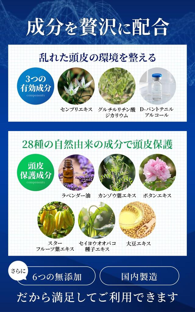 [Содержит уникальный ингредиент HGP] HGP* был разработан на основе исследований происхождения жизни, яйца. Новый материал для роста волос, содержащий роскошное количество «ингредиента для защиты кожи головы HGP». *Специальный яичный желток лизолецитин (ингредиент для защиты кожи головы) разработано с использованием уникального метода
