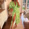 GMXIA Модное платье с принтом в виде фонарика, рукава-фонарика, завязки, разреза, воротника-поло, контрастирующие платья миди
