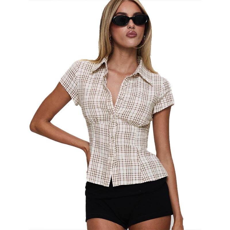 Женская сексуальная рубашка с двумя пуговицами, клетчатый узор, блузки с коротким рукавом, тонкий топ, повседневная, для поездок на работу, модная, для офиса, лето 2025 г.
