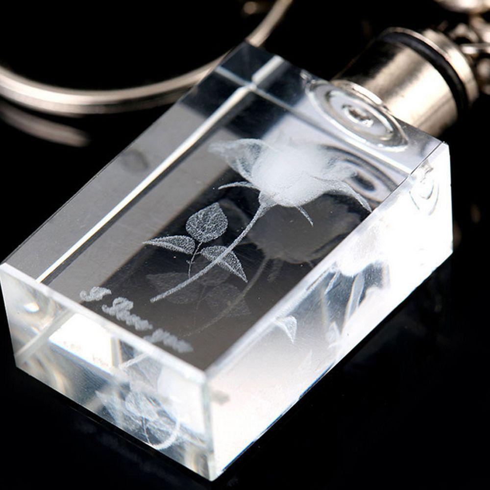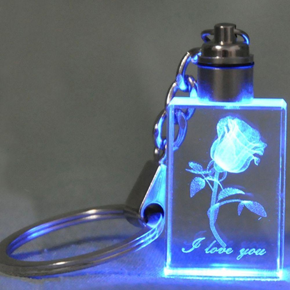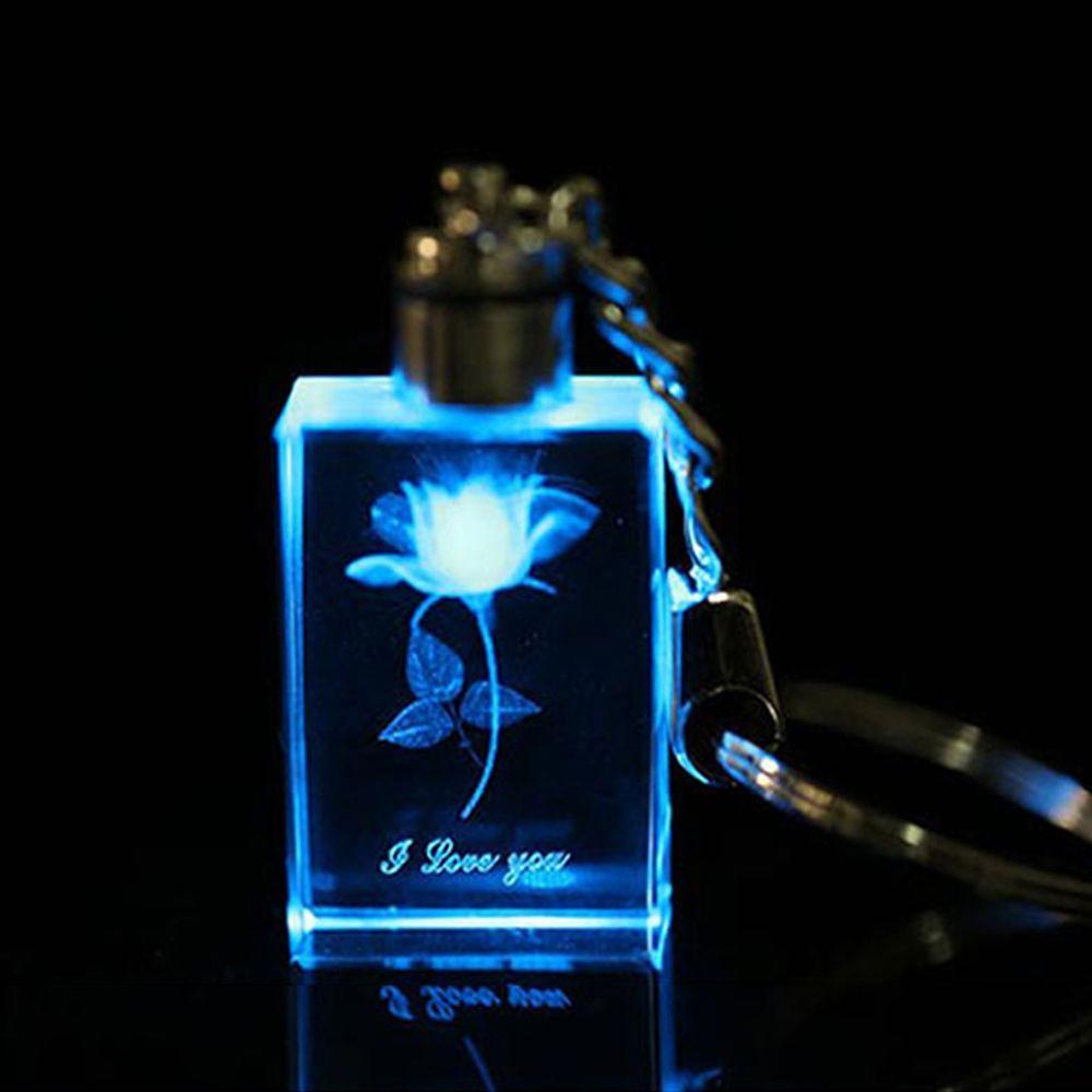 Cute New Charm Glass Gift LED Valentine's Day Blue Light Laser Engraved Key Chain Rose 3D Keyring