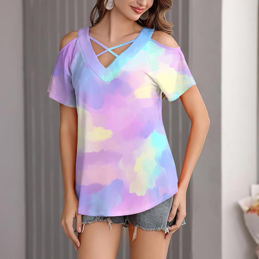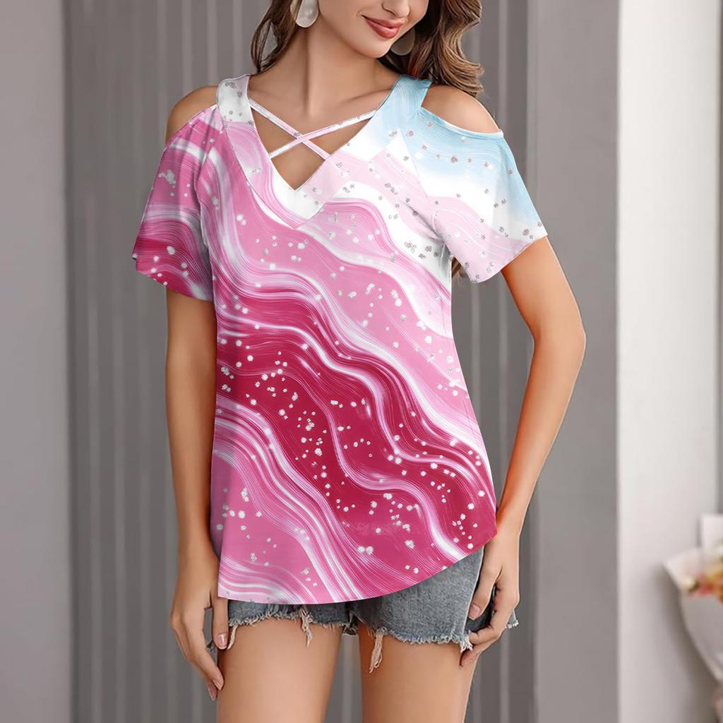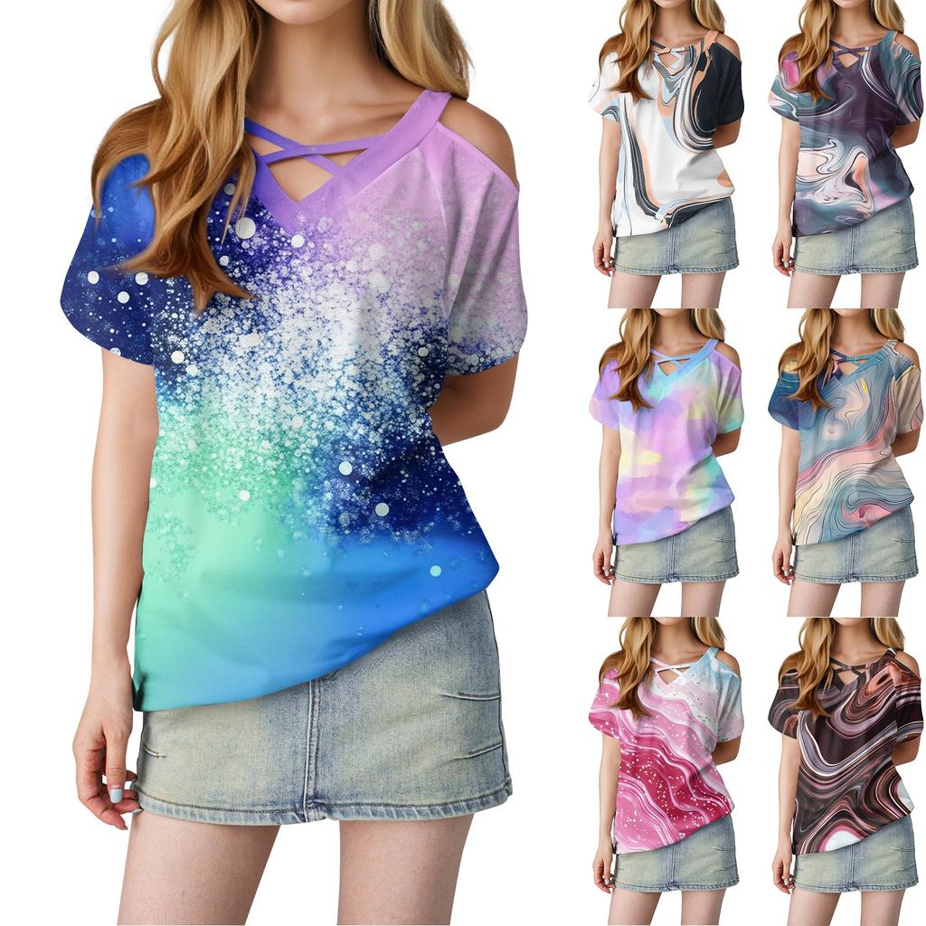 Женская футболка свободного покроя с открытыми плечами, V-образным вырезом и короткими рукавами, с градиентным принтом