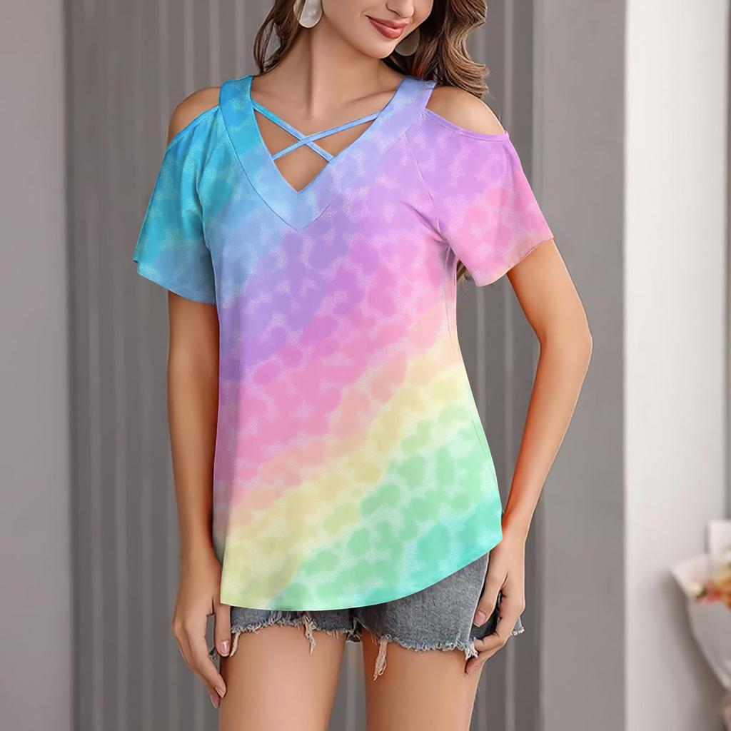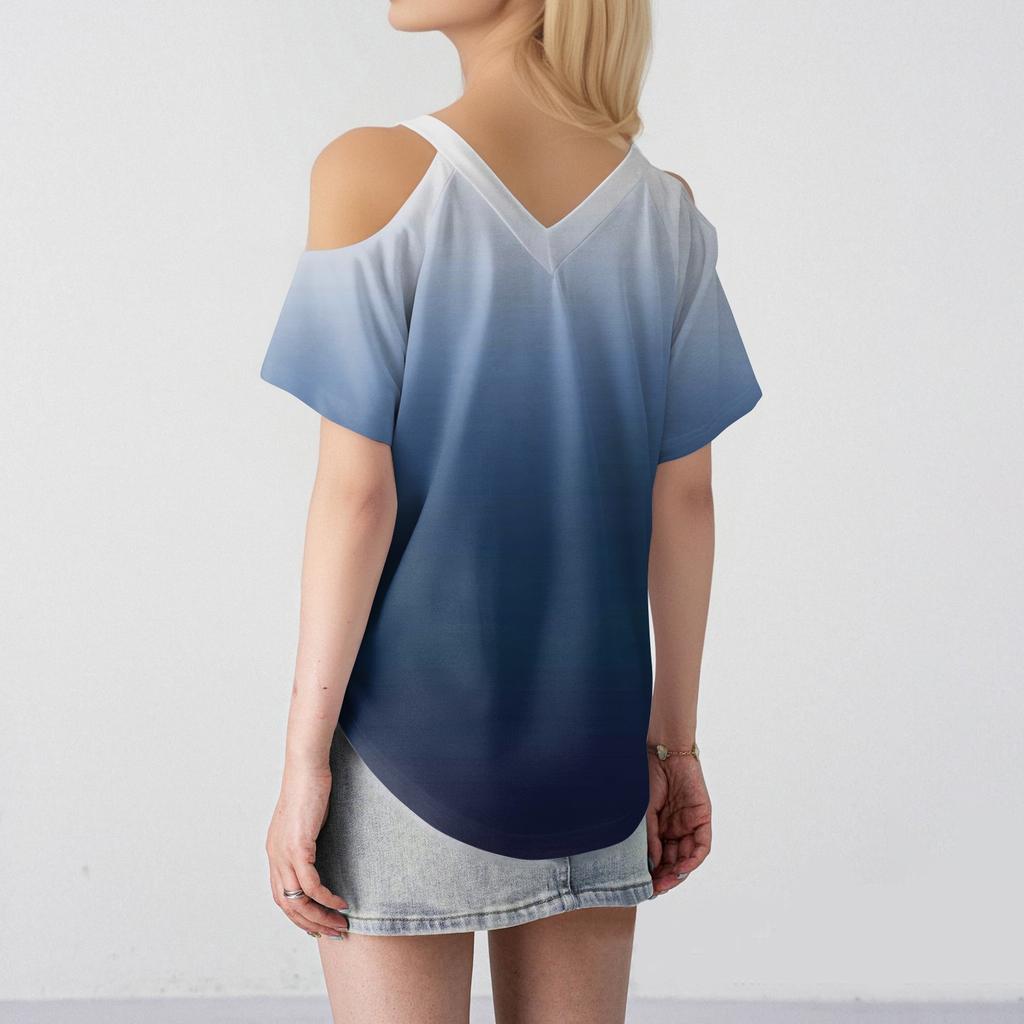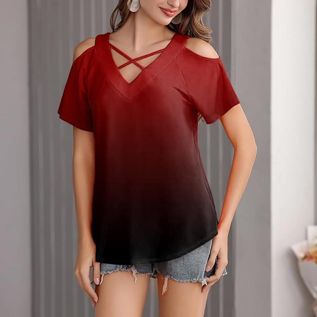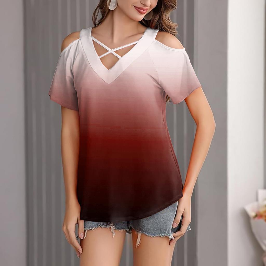 Женская футболка свободного покроя с открытыми плечами, V-образным вырезом и короткими рукавами, с градиентным принтом