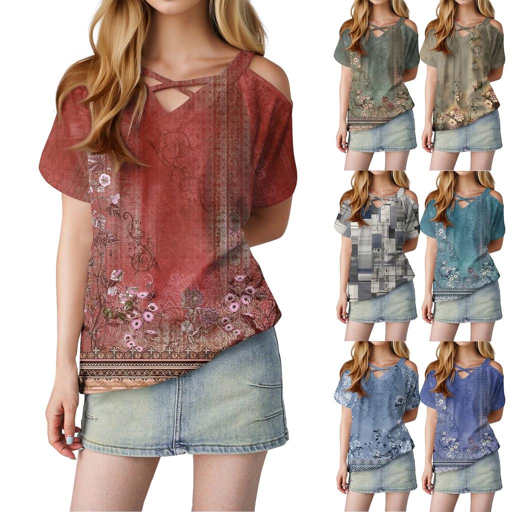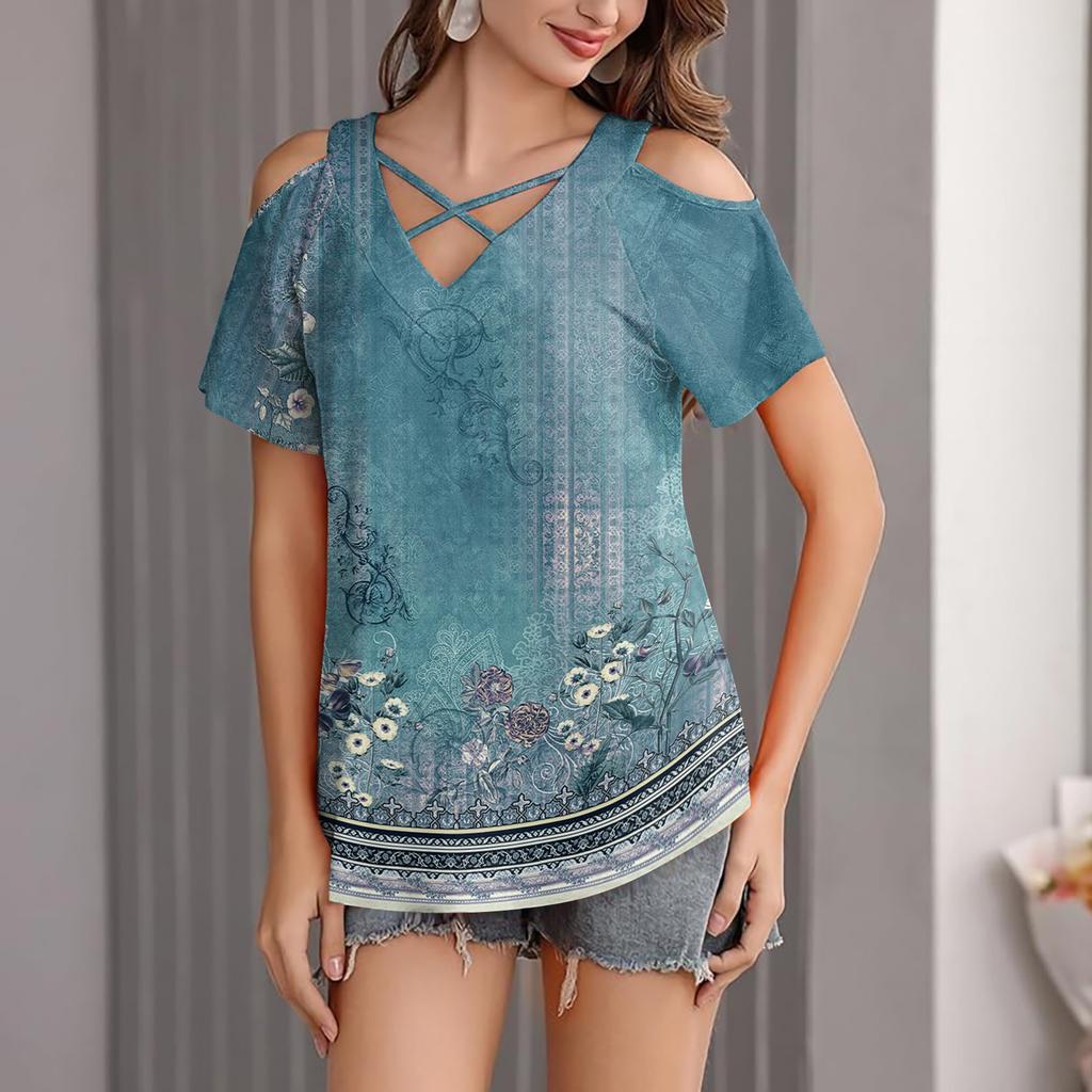 Женская повседневная футболка с цветочным принтом, открытыми плечами, V-образным вырезом и короткими рукавами