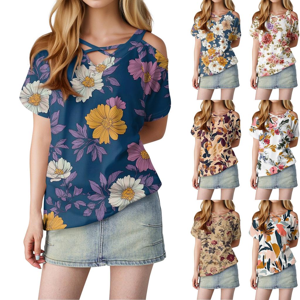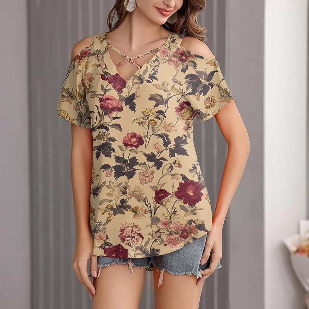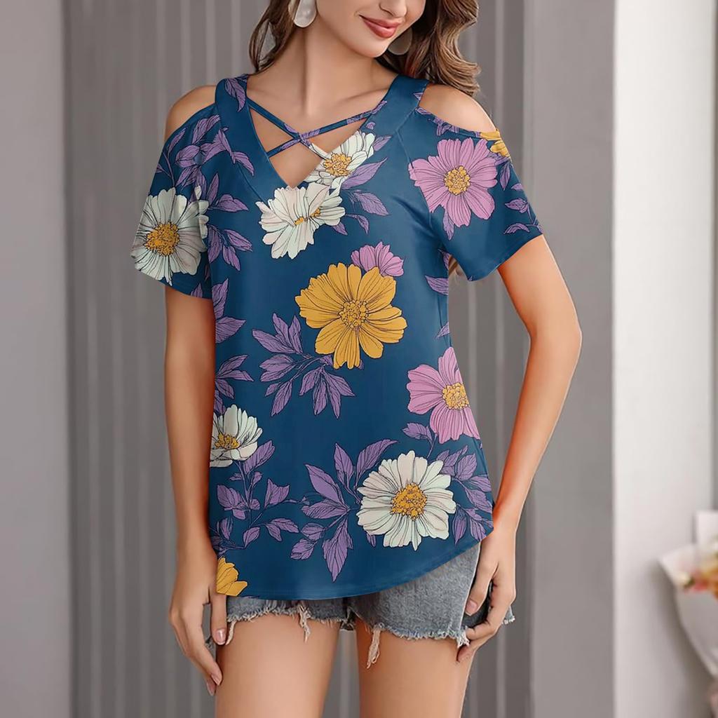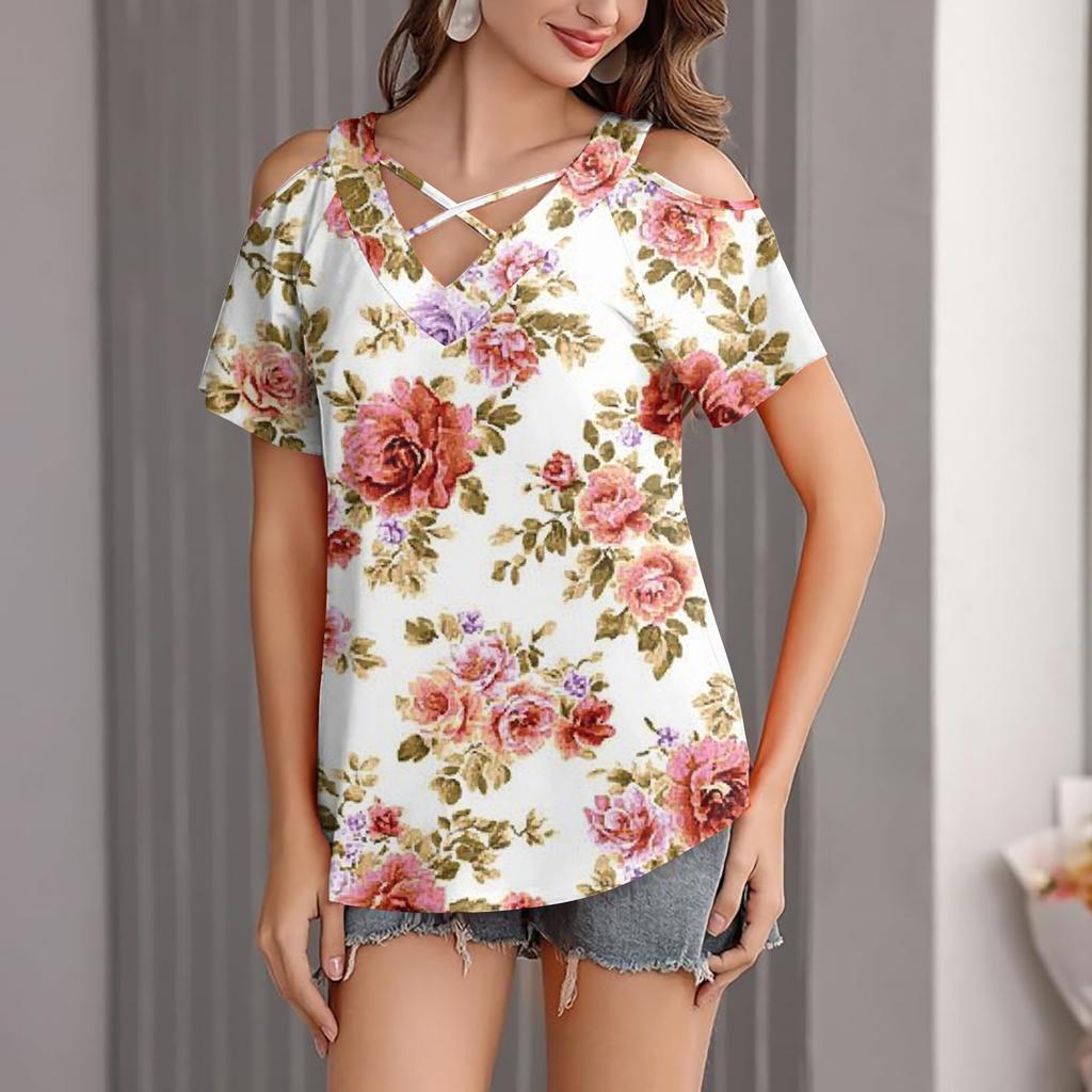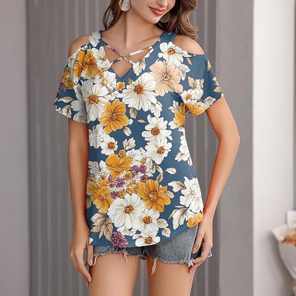 Женская повседневная футболка с цветочным принтом, открытыми плечами, V-образным вырезом и короткими рукавами