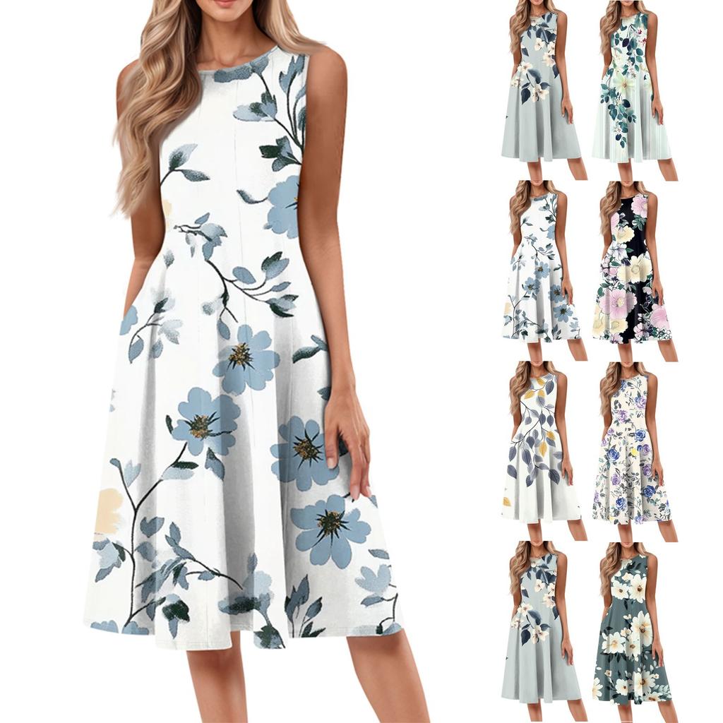 Женское повседневное модное платье миди с цветочным принтом и круглым вырезом без рукавов — купить товар онлайн с бесплатной доставкой по всему миру!