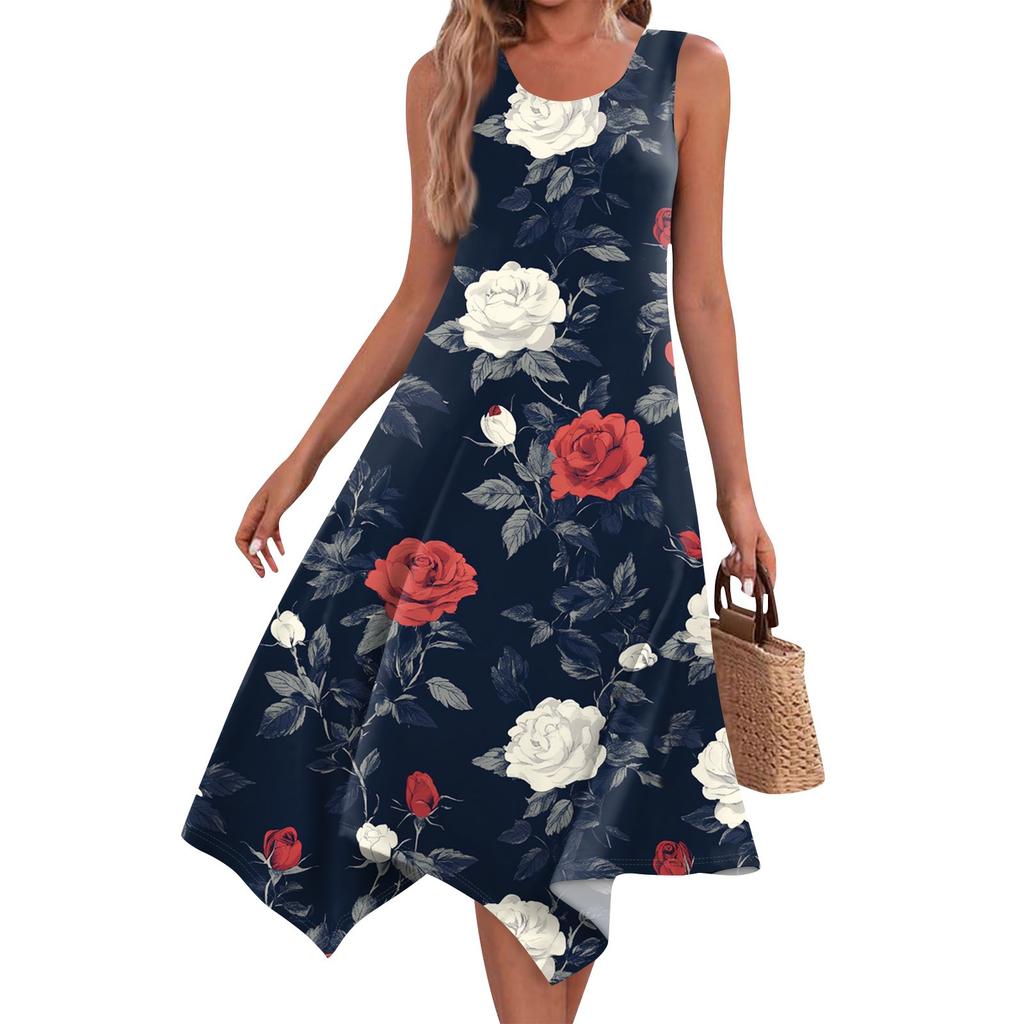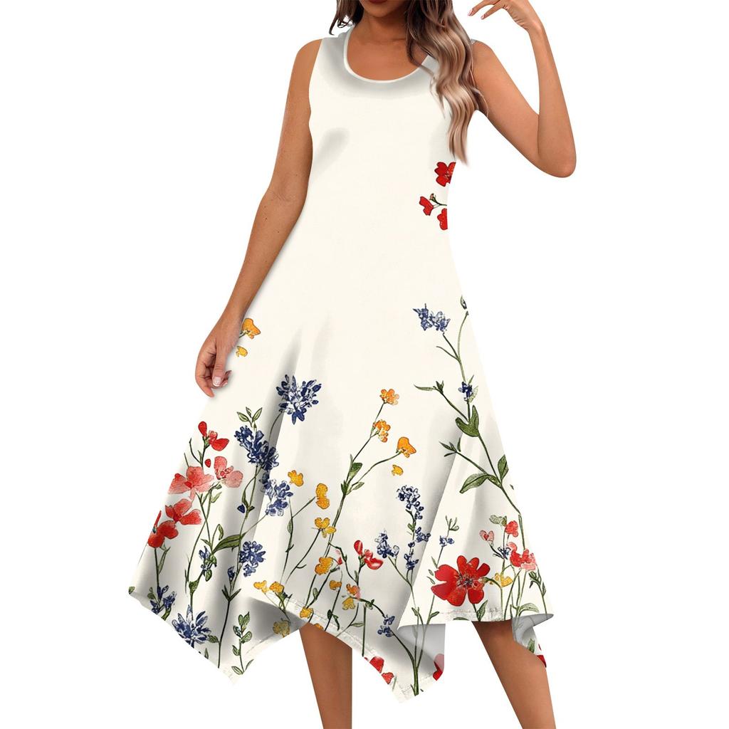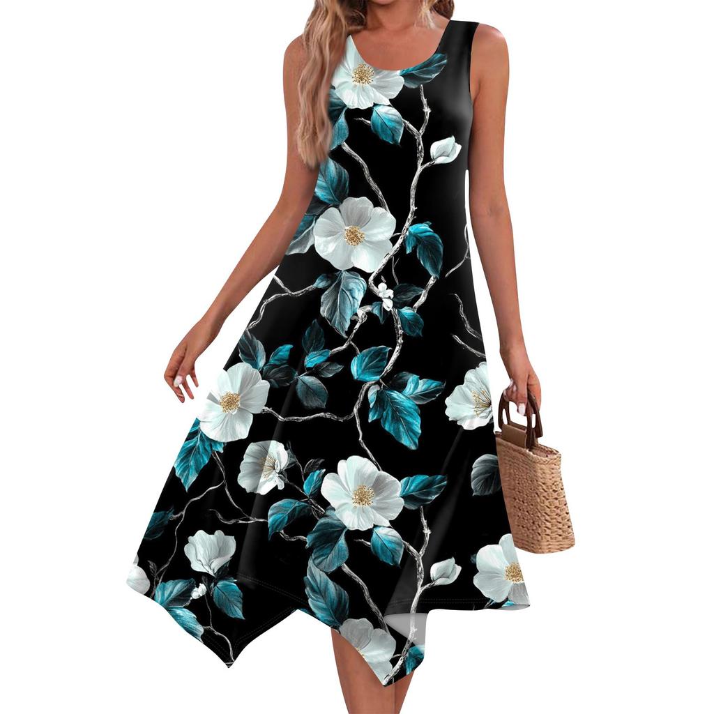 Женское повседневное модное платье миди с круглым вырезом без рукавов и принтом, неровным подолом, платье миди с подолом