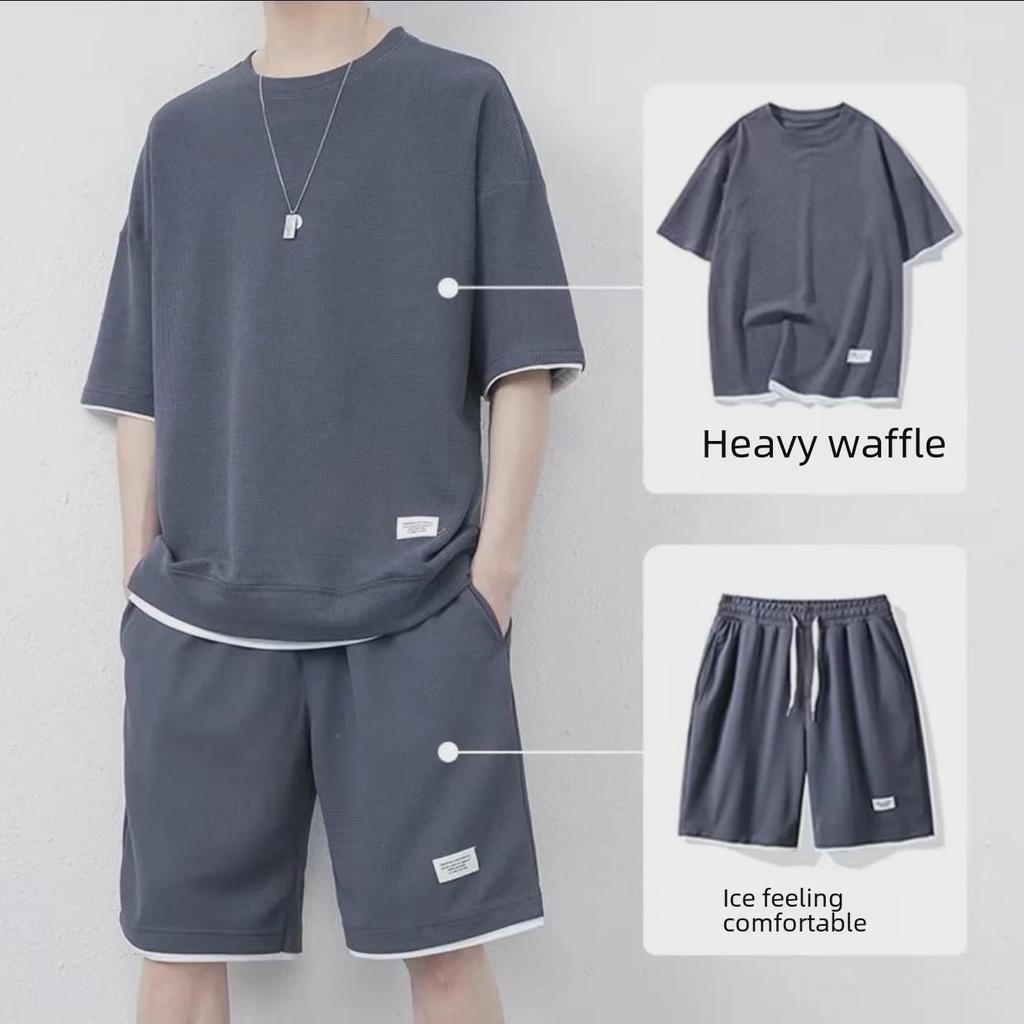 Мужской летний повседневный костюм из вафельного шелка Ice Silk: Комплект из свободной футболки с коротким рукавом и спортивных шорт