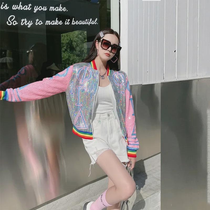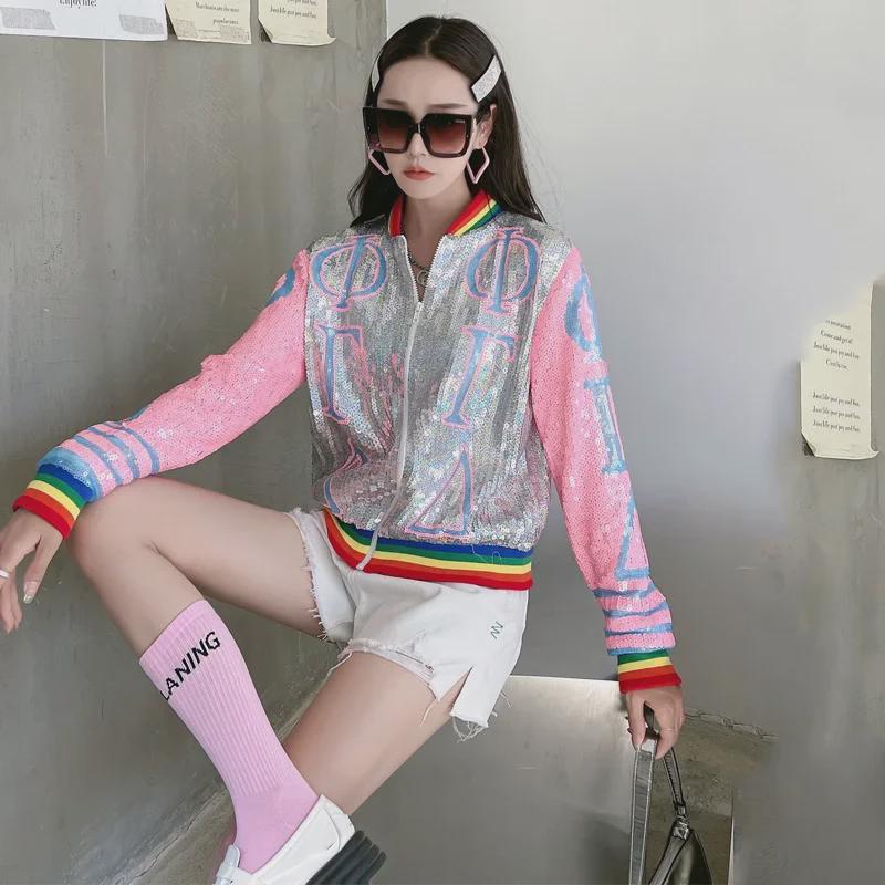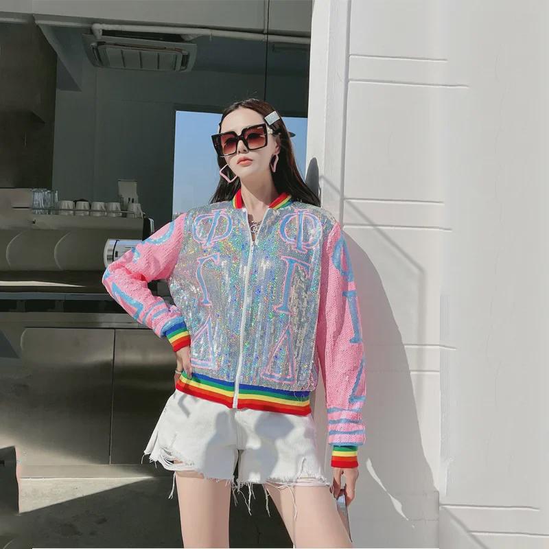 Бейсбольная куртка с пайетками: Модный стиль хип-хоп, европейский дизайн, универсальный короткий воротник-стойка, свободный крой, отделка буквами