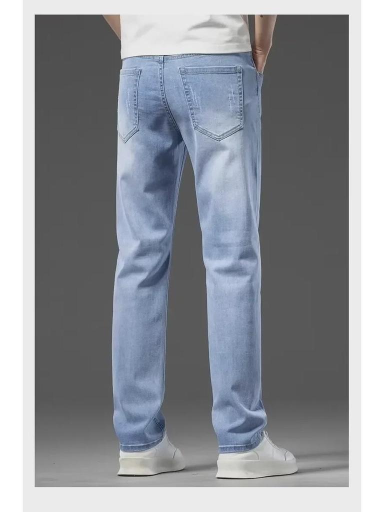 Мужские светло-голубые эластичные джинсы - лето 2024 года, свободный прямой крой, универсальный тренд