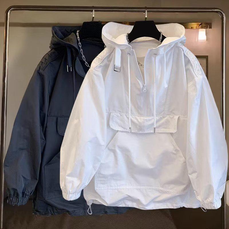 Мужская куртка в японском стиле с капюшоном и большими карманами — свободный крой, повседневная рабочая одежда для весны и осени.