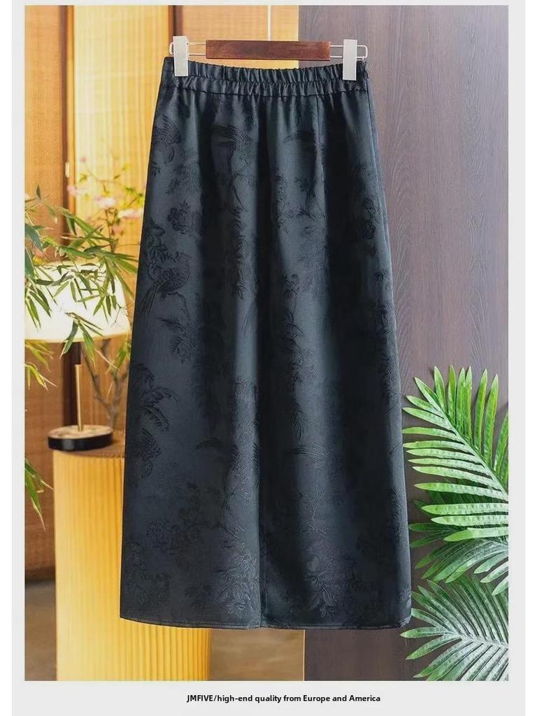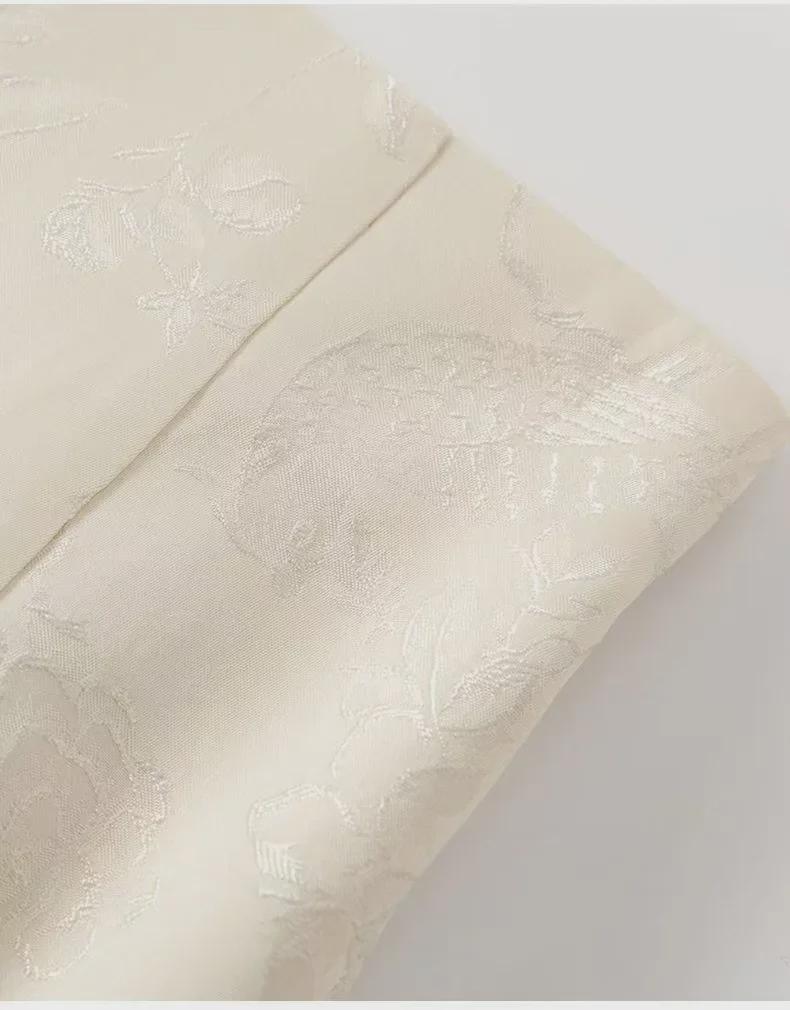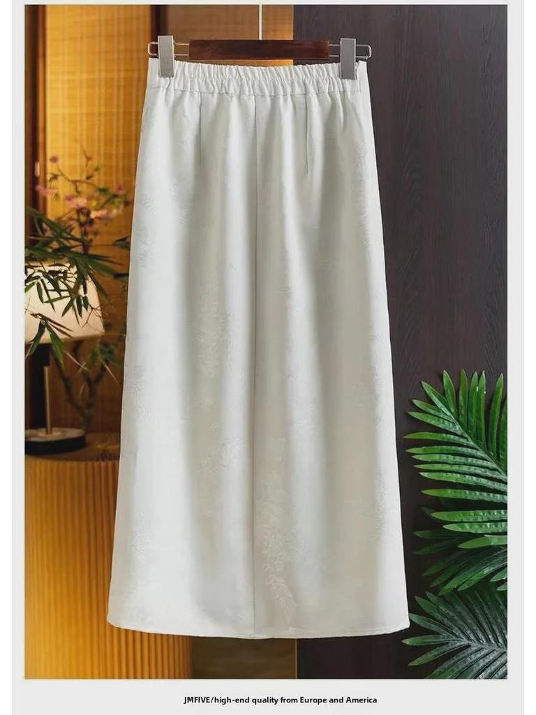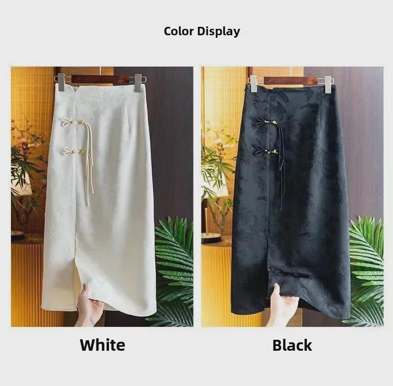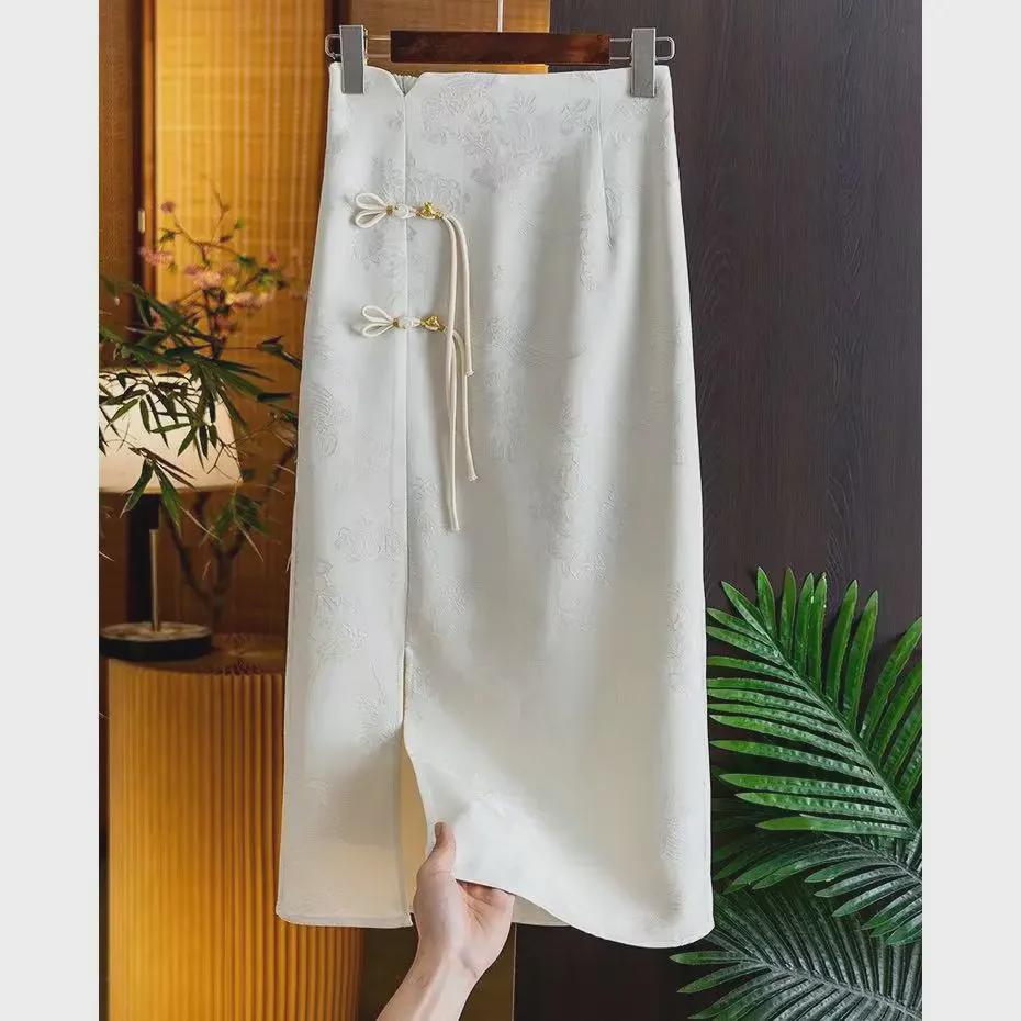 Юбка из хлопково-льняного жаккарда премиум-класса с бисерными пуговицами и разрезом на высокой талии — в стиле ретро-китайский для весны/лета