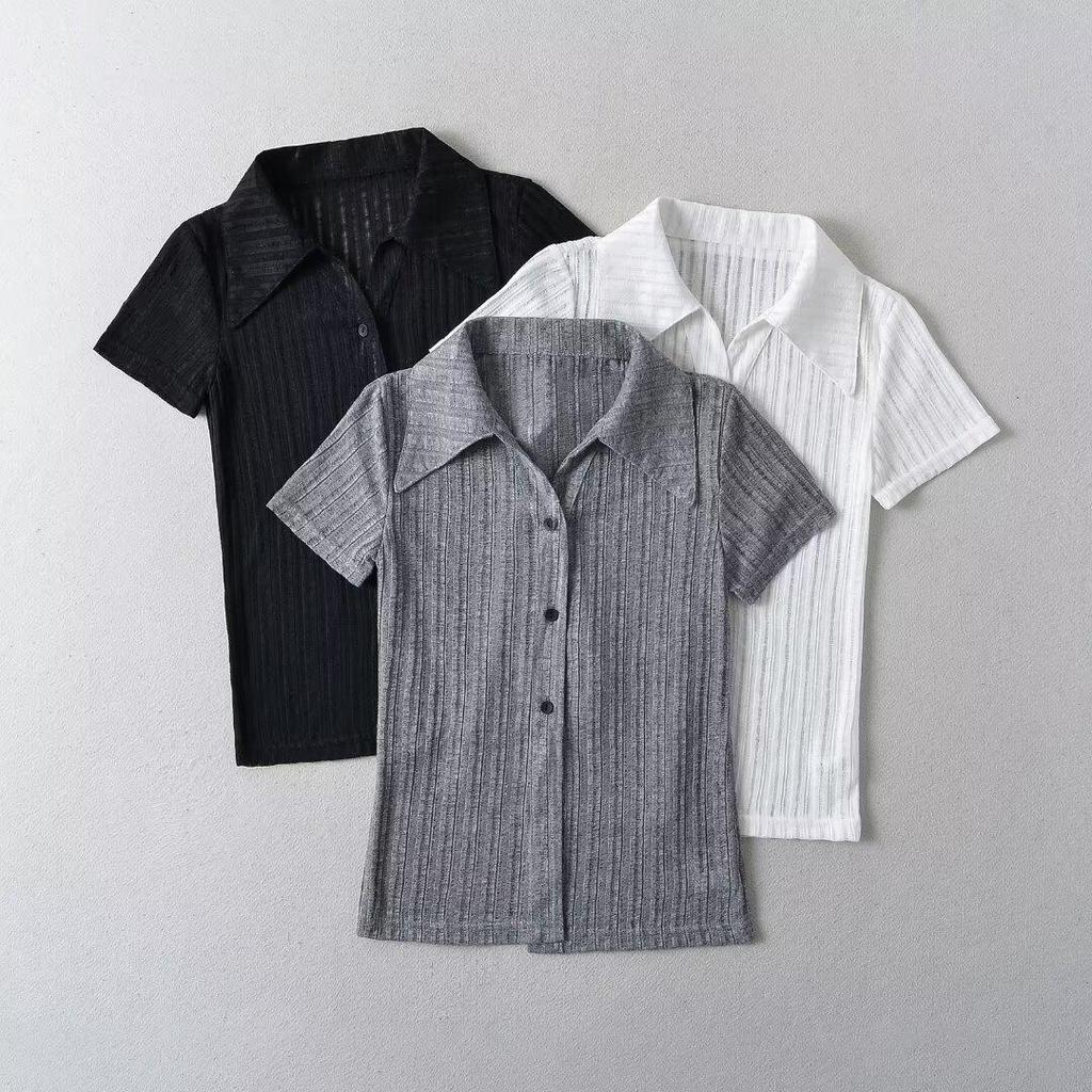 2024 Летний приталенный кардиган с воротником поло и короткими рукавами в рубчик для женщин - европейский и американский стиль горячей девушки